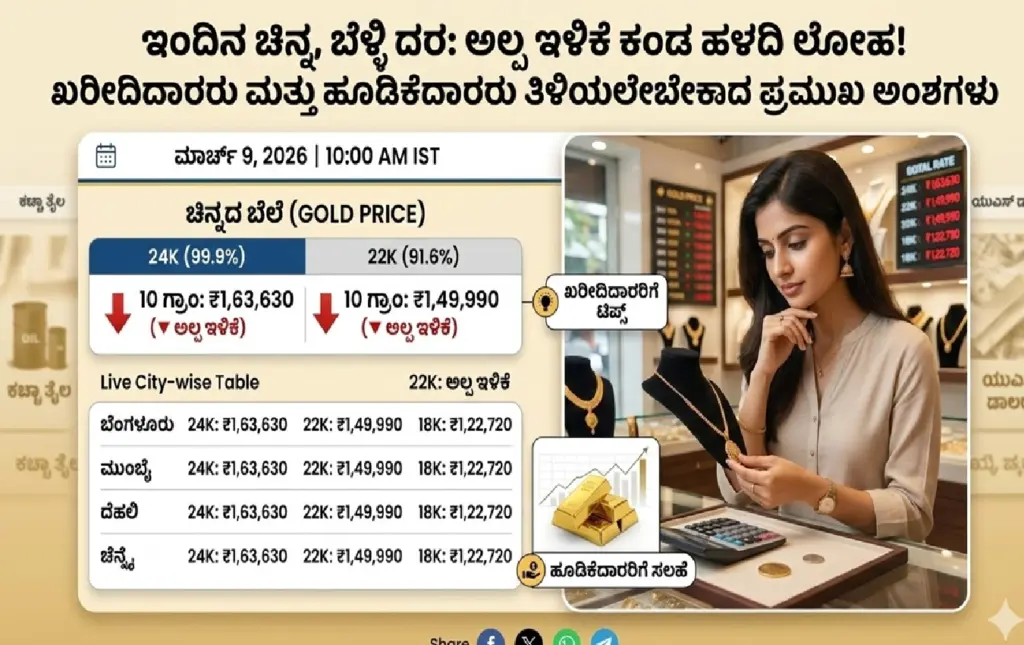 ಬೆಂಗಳೂರು: ಜಾಗತಿಕ ಮಾರುಕಟ್ಟೆಯಲ್ಲಿನ ಏರಿಳಿತ ಹಾಗೂ ಮಧ್ಯಪ್ರಾಚ್ಯದಲ್ಲಿ ಹೆಚ್ಚುತ್ತಿರುವ ಭೌಗೋಳಿಕ ರಾಜಕೀಯ ಉದ್ವಿಗ್ನತೆಯ ನಡುವೆಯೂ, ಭಾರತೀಯ ಮಾರುಕಟ್ಟೆಯಲ್ಲಿ ಇಂದು (ಸೋಮವಾರ, ಮಾರ್ಚ್ 9) ಚಿನ್ನ ಮತ್ತು ಬೆಳ್ಳಿ ದರಗಳಲ್ಲಿ ಅಲ್ಪ ಇಳಿಕೆ ಕಂಡುಬಂದಿದೆ. ಕಳೆದ ಕೆಲವು ತಿಂಗಳುಗಳಿಂದ ಸತತ ಏರಿಕೆ ಕಂಡಿದ್ದ ಬೆಲೆಗಳು, ಇದೀಗ ಲಾಭದ ಬುಕ್ಕಿಂಗ್ (Profit Booking) ಕಾರಣದಿಂದಾಗಿ ಕೊಂಚ ತಣ್ಣಗಾಗಿವೆ.