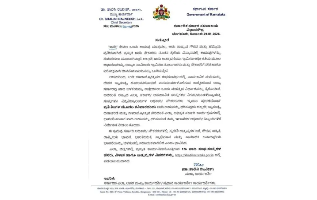 ಆದುದರಿಂದ, 77ನೇ ಗಣರಾಜ್ಯೋತ್ಸವದ ಶುಭಸಂದರ್ಭದಲ್ಲಿ, ಸಾರ್ವಜನಿಕ ಸೇವೆಯನ್ನು ದೇಶದ ಸ್ವಾತಂತ್ರ್ಯ ಹೋರಾಟದೊಂದಿಗೆ ಮರುಸಂಪರ್ಕಗೊಳಿಸುವ ಉದ್ದೇಶದಿಂದ ರಾಜ್ಯ ಸರ್ಕಾರವು ಖಾದಿ ಬಳಕೆಯನ್ನು ಉತ್ತೇಜಿಸಲು ಒಂದು ಮಹತ್ವದ ನಿರ್ಧಾರವನ್ನು ಕೈಗೊಂಡಿದೆ. ಅದರಂತೆ, ರಾಜ್ಯದ ಎಲ್ಲಾ ಸರ್ಕಾರಿ/ ಅನುದಾನಿತ ಸಂಸ್ಥೆಗಳು/ ನಿಗಮ/ಮಂಡಳಿ/ಸ್ಮಾಯತ್ತ ಸಂಸ್ಥೆಗಳು/ ವಿಶ್ವವಿದ್ಯಾಲಯಗಳ ಅಧಿಕಾರಿ/ ನೌಕರರುಗಳು “ಸ್ವಯಂ ಪ್ರೇರಣೆಯಿಂದ” ಪ್ರತಿ ತಿಂಗಳ ಮೊದಲ ಶನಿವಾರದಂದು ಖಾದಿ ಉಡುಪನ್ನು ಧರಿಸುವುದು ಅಲ್ಲದೇ, ಸ್ವಾತಂತ್ರ ದಿನಾಚರಣೆ ಮತ್ತು ಗಣರಾಜ್ಯೋತ್ಸವ ಸೇರಿದಂತೆ ಎಲ್ಲಾ ಅಧಿಕೃತ ಸರ್ಕಾರಿ ಕಾರ್ಯಕ್ರಮಗಳಲ್ಲಿ ಭಾಗವಹಿಸುವಾಗ ಖಾದಿ ಉಡುಪನ್ನು ಧರಿಸುವಂತೆ ತಮ್ಮ ಇಲಾಖೆಗಳ ಅಧಿಕಾರಿ/ ಸಿಬ್ಬಂದಿಗಳಿಗೆ ನಿರ್ದೇಶನ ನೀಡಲು ಕೋರಿದ್ದಾರೆ.
