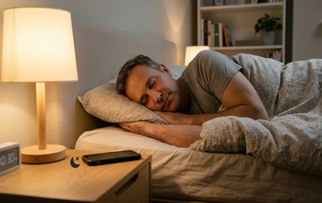 ಒಬ್ಬ ವ್ಯಕ್ತಿ ಮಲಗುವ ಮುನ್ನ ಮೊಬೈಲ್ ಬದಿಗಿಟ್ಟು ವಿಶ್ರಮಿಸುತ್ತಿರುವುದು.