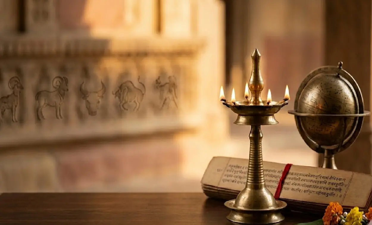 ಜ್ಯೋತಿಷ್ಯ ಶಾಸ್ತ್ರದ ಪ್ರಕಾರ ಹನ್ನೆರಡು ರಾಶಿಗಳ ಚಿಹ್ನೆಗಳು ಮತ್ತು ನಕ್ಷತ್ರಗಳ ಸ್ಥಾನವನ್ನು ತೋರಿಸುವ ಸುಂದರ ಚಿತ್ರ.