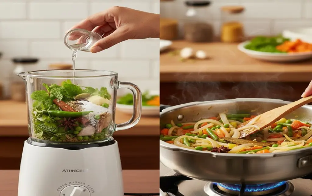 - ಮಸಾಲೆ ಫ್ರೈ: ಈಗ ರುಬ್ಬಿದ ಹಸಿರು ಮಸಾಲೆ ಪೇಸ್ಟ್ ಸೇರಿಸಿ. ಹಸಿ ವಾಸನೆ ಹೋಗಿ ಎಣ್ಣೆ ಬಿಡುವವರೆಗೆ (3-4 ನಿಮಿಷ) ಚೆನ್ನಾಗಿ ಹುರಿಯಿರಿ. ನಂತರ ಟೊಮೆಟೊ ಸೇರಿಸಿ ಫ್ರೈ ಮಾಡಿ.