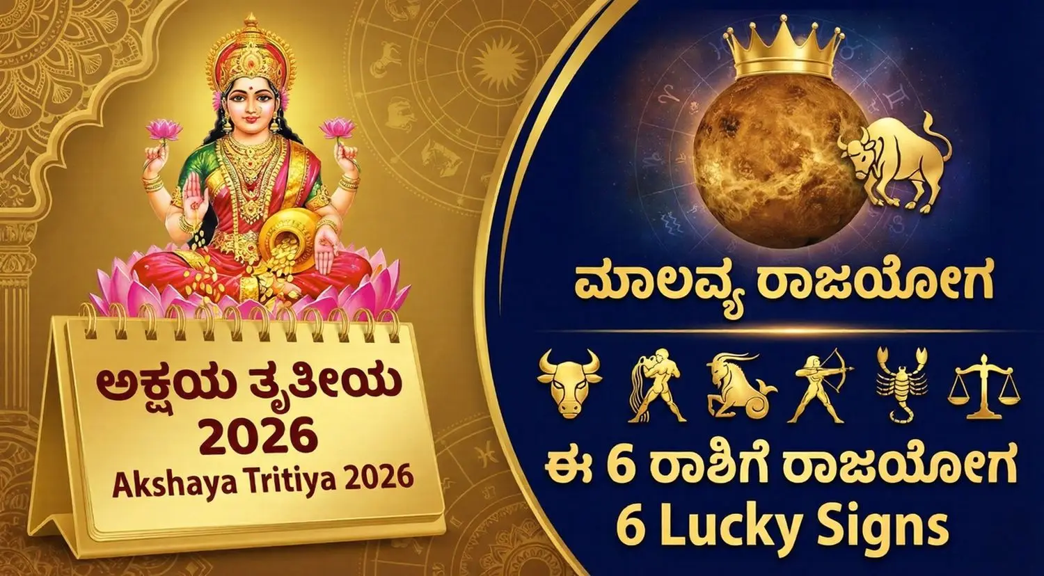 ಅಕ್ಷಯ ತೃತೀಯ (Akshaya Tritiya) ಎಂದರೆ ಭಾರತೀಯ ಸಂಪ್ರದಾಯದಲ್ಲಿ ಎಂದಿಗೂ ಕ್ಷಯಿಸದ ಸಂಪತ್ತನ್ನು ನೀಡುವ ದಿನ. ಈ ವರ್ಷದ ಅಕ್ಷಯ ತೃತೀಯವು ಜ್ಯೋತಿಷ್ಯ ಶಾಸ್ತ್ರದ ದೃಷ್ಟಿಯಿಂದ ಅತ್ಯಂತ ವಿಶಿಷ್ಟವಾಗಿದೆ. 2026 ರ ಏಪ್ರಿಲ್ 19 ರಂದು ಸಂಪತ್ತಿನ ಕಾರಕನಾದ ಶುಕ್ರ ಗ್ರಹವು ತನ್ನ ಸ್ವಕ್ಷೇತ್ರವಾದ ವೃಷಭ ರಾಶಿಗೆ ಪ್ರವೇಶಿಸುತ್ತಿದ್ದಾನೆ. ಈ ಸಂಕ್ರಮಣದಿಂದಾಗಿ ಮಾಲವ್ಯ ರಾಜಯೋಗ ನಿರ್ಮಾಣವಾಗುತ್ತಿದ್ದು, ಇದು ಪಂಚ ಮಹಾಪುರುಷ ಯೋಗಗಳಲ್ಲಿ ಒಂದಾಗಿದೆ. ಈ ಲೇಖನದಲ್ಲಿ ಈ ರಾಜಯೋಗದಿಂದ ಅದೃಷ್ಟ ಪಡೆಯಲಿರುವ 6 ರಾಶಿಗಳ ಬಗ್ಗೆ ಸಂಪೂರ್ಣ ಮಾಹಿತಿ ನೀಡಲಾಗಿದೆ.