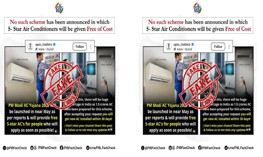 ಪಿಎಂ ಮೋದಿ (PM Modi) ಎಸಿ ಯೋಜನೆ 2025: ಪಿಎಂ ಮೋದಿ ಎಸಿ ಯೋಜನೆ 2025 ರ ಅಡಿಯಲ್ಲಿ ಭಾರತ ಸರ್ಕಾರವು 1.5 ಕೋಟಿ 5 ಸ್ಟಾರ್ ಹವಾನಿಯಂತ್ರಣಗಳನ್ನು ಉಚಿತವಾಗಿ ವಿತರಿಸುತ್ತಿದೆ ಎಂದು ಸಂದೇಶ ಬಂದಿದೆಯೇ? ಅದರೆ ಅದನ್ನು ನಂಬ ಬೇಡಿ – ಇದು ಸುಳ್ಳು ಸುದ್ದಿಯಾಗಿದ್ದು. ಅಂತಹ ಯಾವುದೇ ಯೋಜನೆ ಅಸ್ತಿತ್ವದಲ್ಲಿಲ್ಲ ಎಂದು ಅಧಿಕೃತ ಪಿಐಬಿ ಫ್ಯಾಕ್ಟ್ ಚೆಕ್ ದೃಢಪಡಿಸಿದೆ. ಈ ಮೂಲಕ ಸುಳ್ಳು ಸುದ್ದಿಯನ್ನು ನಂಬಬಾರದು ಅಂತ ತಿಳಿಸಿದೆ.