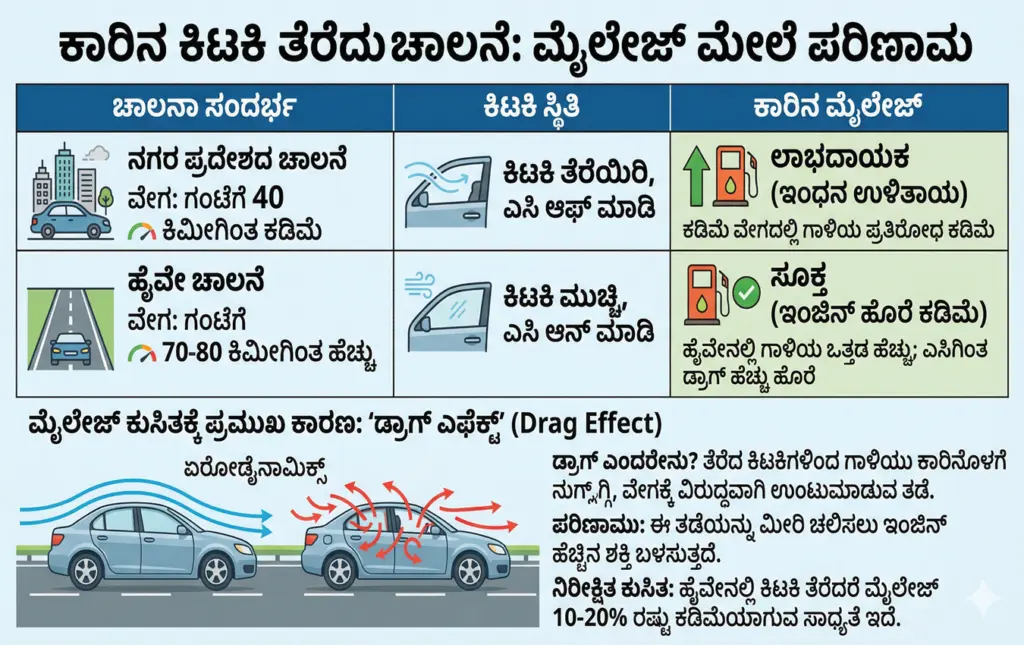 ಎಸಿ ಆನ್ ಮಾಡಿದಾಗ ಇಂಜಿನ್ ಮೇಲಿನ ಲೋಡ್ ಅಲ್ಪಪ್ರಮಾಣದಲ್ಲಿ ಹೆಚ್ಚಾಗುತ್ತದೆ. ಇದು ಸಾಮಾನ್ಯವಾಗಿ ಶೇಕಡಾ 5 ರಿಂದ 10 ರಷ್ಟು ಇಂಧನ ಬಳಕೆಯನ್ನು ಹೆಚ್ಚಿಸಬಹುದು. - ಹೈವೇನಲ್ಲಿ ವಿಂಡೋ ತೆರೆದರೆ ಮೈಲೇಜ್ ನಿಜವಾಗಿಯೂ ಕಡಿಮೆಯಾಗುತ್ತದೆಯೇ