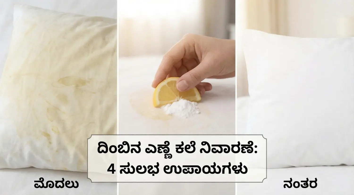 ನಾವೆಲ್ಲರೂ ಕೂದಲಿನ ಆರೋಗ್ಯಕ್ಕಾಗಿ ರಾತ್ರಿ ಹೊತ್ತು ಎಣ್ಣೆ ಹಚ್ಚಿ ಮಲಗುತ್ತೇವೆ. ಆದರೆ ಮರುದಿನ ಬೆಳಿಗ್ಗೆ ಎದ್ದಾಗ ದಿಂಬಿನ ಕವರ್ ಮೇಲೆ ಬಿದ್ದಿರುವ ಮೊಂಡುತನದ ಎಣ್ಣೆಯ ಕಲೆಗಳನ್ನು ನೋಡಿ ಬೇಸರವಾಗುವುದು ಸಹಜ. ಈ ಕಲೆಗಳು ಸುಲಭವಾಗಿ ಹೋಗುವುದಿಲ್ಲ ಮತ್ತು ದಿಂಬು ಹಳದಿ ಬಣ್ಣಕ್ಕೆ ತಿರುಗಿ ಅಸಹ್ಯವಾಗಿ ಕಾಣಿಸುತ್ತದೆ. ಅನೇಕರು ಈ ಕಲೆ ಹೋಗುವುದಿಲ್ಲ ಎಂದು ದಿಂಬಿನ ಕವರನ್ನೇ ಎಸೆದುಬಿಡುತ್ತಾರೆ. ಆದರೆ ಇನ್ನು ಮುಂದೆ ಹಾಗೆ ಮಾಡುವ ಅಗತ್ಯವಿಲ್ಲ. ಮನೆಯಲ್ಲಿರುವ ಈ ಸರಳ ವಸ್ತುಗಳನ್ನು ಬಳಸಿ ಹಳೆಯ ಕಲೆಗಳನ್ನು ಕೂಡ ಸುಲಭವಾಗಿ ತೆಗೆಯಬಹುದು. ಆ ವಿಧಾನಗಳು ಇಲ್ಲಿವೆ: