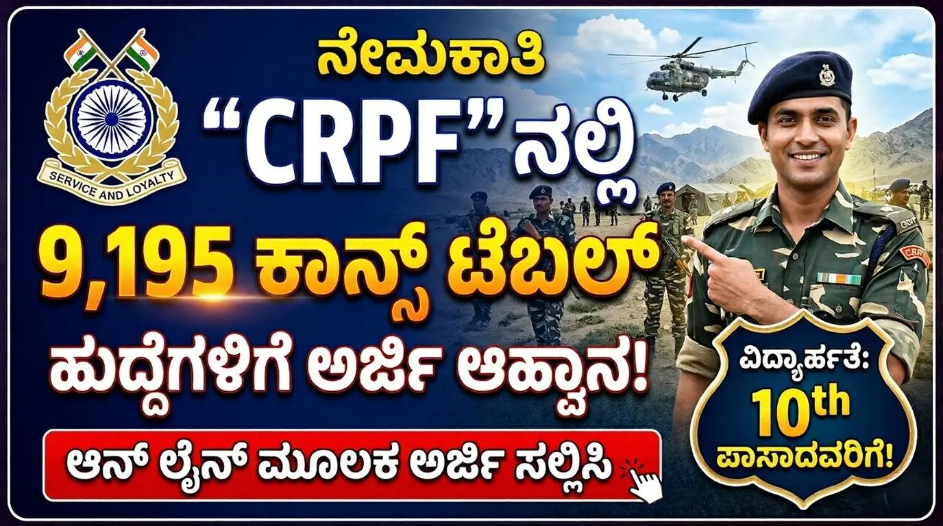 ಭಾರತೀಯ ರಕ್ಷಣಾ ಕ್ಷೇತ್ರದಲ್ಲಿ ಸೇವೆ ಸಲ್ಲಿಸಬೇಕು ಎನ್ನುವ ಹಂಬಲ ಹೊಂದಿರುವ ಯುವಕ ಮತ್ತು ಯುವತಿಯರಿಗೆ ಕೇಂದ್ರ ಸರ್ಕಾರವು ಭರ್ಜರಿ ಸಿಹಿಸುದ್ದಿ ನೀಡಿದೆ. ಕೇಂದ್ರ ಮೀಸಲು ಪೊಲೀಸ್ ಪಡೆ ಅಥವಾ ಸಿಆರ್ಪಿಎಫ್ CRPF ಸಿಪಾಯಿ ಹುದ್ದೆಗಳ ಭರ್ತಿಗೆ ಬೃಹತ್ ನೇಮಕಾತಿ ಪ್ರಕ್ರಿಯೆಯನ್ನು ಆರಂಭಿಸಿದೆ. ಈ ಅಧಿಸೂಚನೆಯ ಪ್ರಕಾರ ತಾಂತ್ರಿಕ, ಟ್ರೇಡ್ಸ್ಮನ್ ಮತ್ತು ಪಯೋನೀರ್ ವಿಭಾಗಗಳಲ್ಲಿ ಖಾಲಿ ಇರುವ ಒಟ್ಟು 9,195 ಹುದ್ದೆಗಳನ್ನು ಭರ್ತಿ ಮಾಡಲಾಗುತ್ತಿದೆ. ಕೇವಲ 10ನೇ ತರಗತಿ ಪಾಸಾದ ಅಭ್ಯರ್ಥಿಗಳಿಗೆ ಇದು ದೇಶದ ಅತ್ಯುನ್ನತ ಭದ್ರತಾ ಪಡೆಗಳಲ್ಲಿ ಒಂದರಲ್ಲಿ ಕೆಲಸ ಮಾಡುವ ಅಮೂಲ್ಯ ಅವಕಾಶವಾಗಿದೆ.