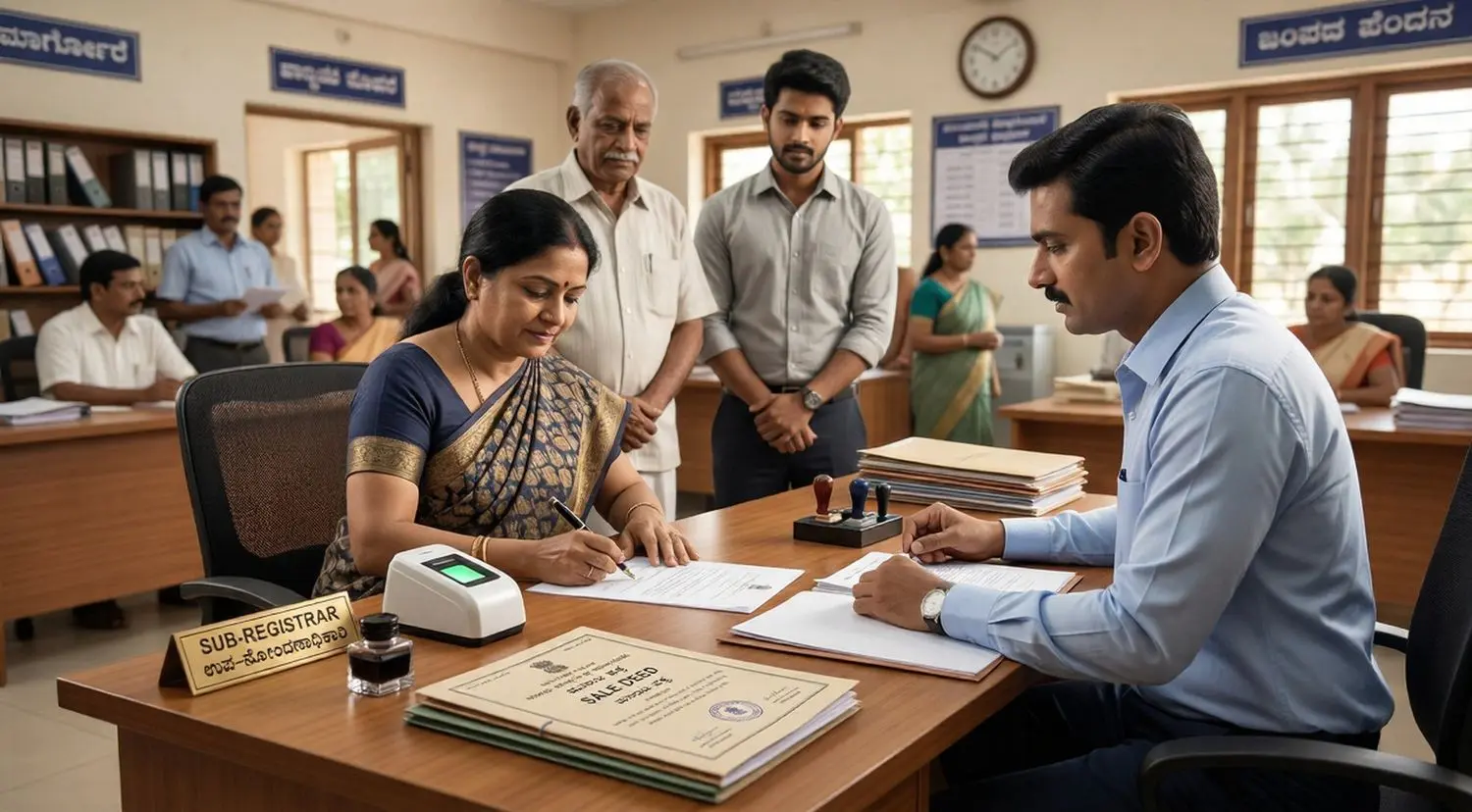 ಶುಲ್ಕ ಪಾವತಿಸಿದ ನಂತರ, ಆಸ್ತಿಯು ಯಾವ ವ್ಯಾಪ್ತಿಗೆ ಬರುತ್ತದೆಯೋ ಆ ಉಪ-ನೋಂದಣಾಧಿಕಾರಿ (Sub-Registrar) ಕಚೇರಿಗೆ ಭೇಟಿ ನೀಡಬೇಕು. ಇಲ್ಲಿ ಅಪಾಯಿಂಟ್ಮೆಂಟ್ ಪಡೆದು ನಿಗದಿತ ಸಮಯದಲ್ಲಿ ಹಾಜರಾಗುವುದು ಅಗತ್ಯ. ಈ ಸಂದರ್ಭದಲ್ಲಿ ಖರೀದಿದಾರ ಮತ್ತು ಮಾರಾಟಗಾರ ಇಬ್ಬರೂ ಕಡ್ಡಾಯವಾಗಿ ಕಚೇರಿಯಲ್ಲಿ ಉಪಸ್ಥಿತರಿರಬೇಕು.