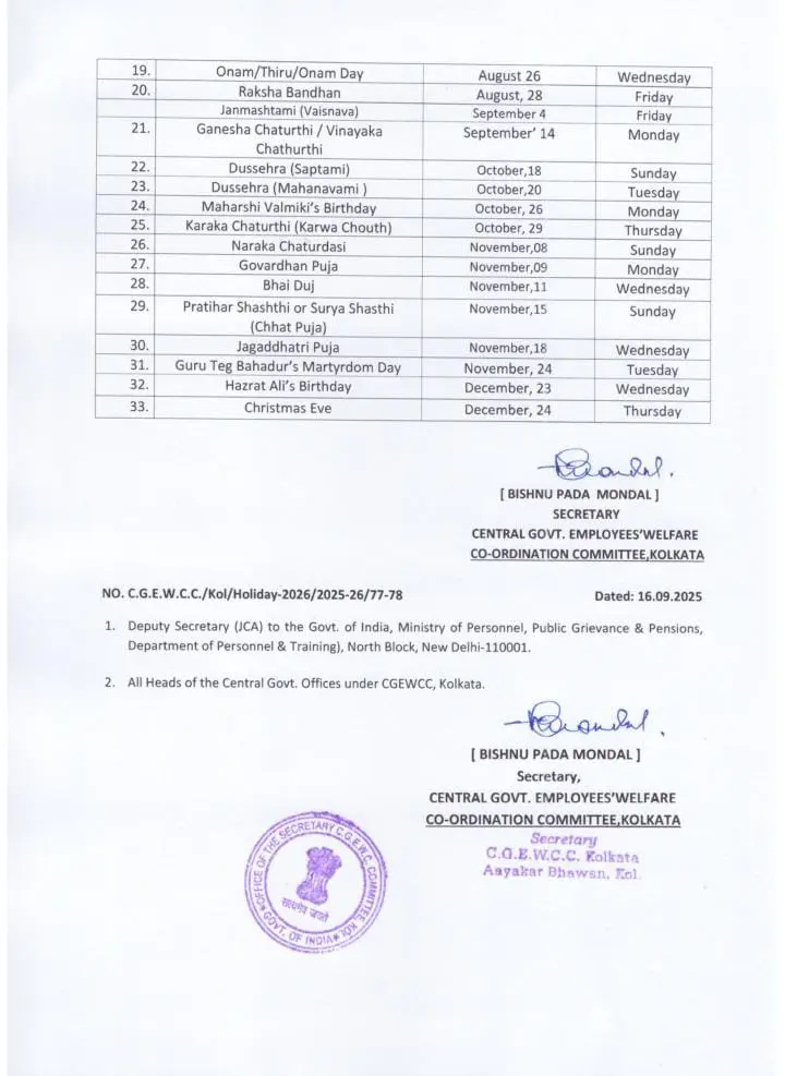 ನವದೆಹಲಿ: ಕೇಂದ್ರ ಸರ್ಕಾರವು(Central Government) 2026 ರ ಸಾರ್ವತ್ರಿಕ ರಜಾದಿನಗಳ ಪಟ್ಟಿಯನ್ನು ಬಿಡುಗಡೆ ಮಾಡಿದೆ, ಇದರಲ್ಲಿ ಗಣರಾಜ್ಯೋತ್ಸವ, ಸ್ವಾತಂತ್ರ್ಯ ದಿನಾಚರಣೆ, ಮಹಾತ್ಮ ಗಾಂಧಿಯವರ ಜನ್ಮದಿನ, ಕ್ರಿಸ್ಮಸ್ ಮತ್ತು ದೀಪಾವಳಿ, ಈದ್-ಉಲ್-ಫಿತರ್ ಮತ್ತು ಹೋಳಿ ಮುಂತಾದ ಪ್ರಮುಖ ರಾಷ್ಟ್ರೀಯ ಮತ್ತು ಧಾರ್ಮಿಕ ಆಚರಣೆಗಳು ಸೇರಿವೆ. ಈ ಪಟ್ಟಿಯಲ್ಲಿ ಗುಡ್ ಫ್ರೈಡೇ, ಬುದ್ಧ ಪೂರ್ಣಿಮೆ ಮತ್ತು ಗುರುನಾನಕ್ ಅವರ ಜನ್ಮದಿನದಂತಹ ಇತರ ಧಾರ್ಮಿಕ ರಜಾದಿನಗಳು ಸಹ ಸೇರಿವೆ.