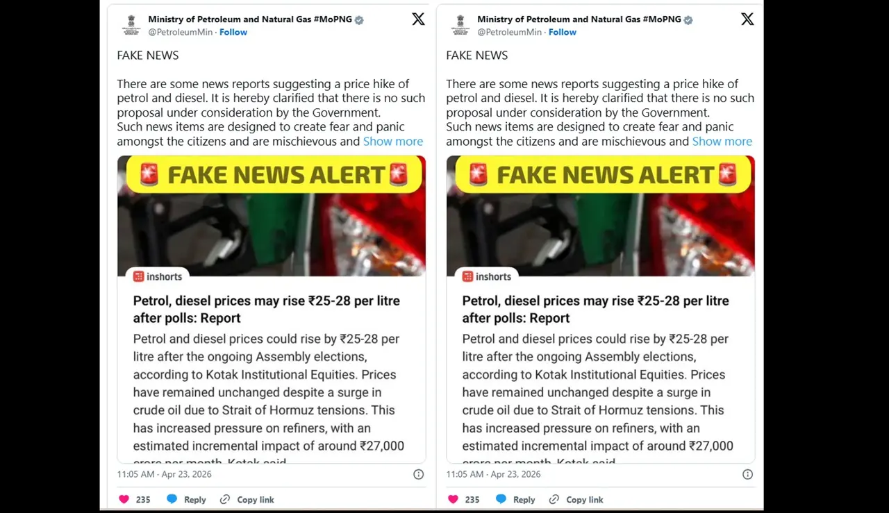ಅಂತರರಾಷ್ಟ್ರೀಯ ಮಟ್ಟದಲ್ಲಿ ರಷ್ಯಾ ಮತ್ತು ಉಕ್ರೇನ್ ಸಂಘರ್ಷ ಅಥವಾ ಮಧ್ಯಪ್ರಾಚ್ಯದ ಉದ್ವಿಗ್ನತೆಯಂತಹ ಭೌಗೋಳಿಕ ರಾಜಕೀಯ ಕಾರಣಗಳಿಂದಾಗಿ ಇಂಧನ ಪೂರೈಕೆಯಲ್ಲಿ ವ್ಯತ್ಯಯ ಉಂಟಾದಾಗಲೂ ಭಾರತವು ತನ್ನ ಆಂತರಿಕ ಮಾರುಕಟ್ಟೆಯಲ್ಲಿ ಬೆಲೆಗಳನ್ನು ಏರಿಸದೆ ಪರ್ಯಾಯ ಮಾರ್ಗಗಳನ್ನು ಹುಡುಕಿಕೊಂಡಿದೆ. ತೈಲ ಕಂಪನಿಗಳು ತಮ್ಮ ಲಾಭಾಂಶವನ್ನು ಬದಿಗಿಟ್ಟು ಜನಸಾಮಾನ್ಯರ ಹಿತದೃಷ್ಟಿಯಿಂದ ಕಾರ್ಯನಿರ್ವಹಿಸಿವೆ. ಬೆಲೆ ಏರಿಕೆಯ ಕುರಿತಾದ ತಪ್ಪು ಮಾಹಿತಿ (Misleading information) ನಾಗರಿಕರಲ್ಲಿ ಅನಗತ್ಯ ಆರ್ಥಿಕ ಒತ್ತಡವನ್ನು ಸೃಷ್ಟಿಸುತ್ತದೆ, ಆದ್ದರಿಂದ ಸಾರ್ವಜನಿಕರು ಕೇವಲ ಅಧಿಕೃತ ಮೂಲಗಳಿಂದ ಬರುವ ಮಾಹಿತಿಯನ್ನು ಮಾತ್ರ ನಂಬಬೇಕು ಎಂದು ಪೆಟ್ರೋಲಿಯಂ ಸಚಿವಾಲಯವು ಮನವಿ ಮಾಡಿದೆ.