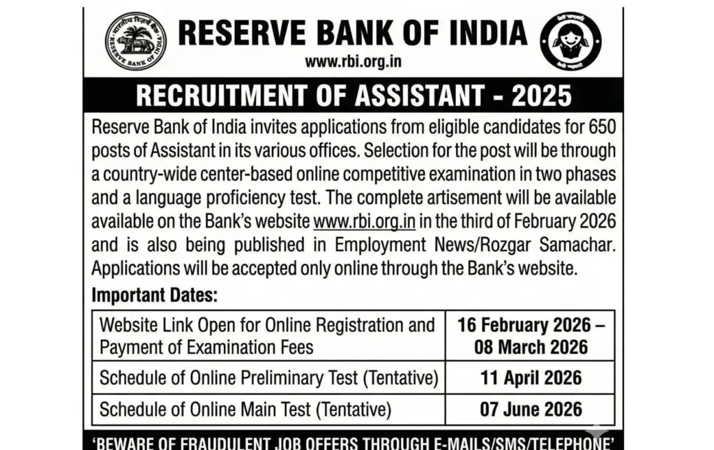 RBI Assistant Notification 2026 Notification released for 650 posts; Here is the direct link to apply and eligibility