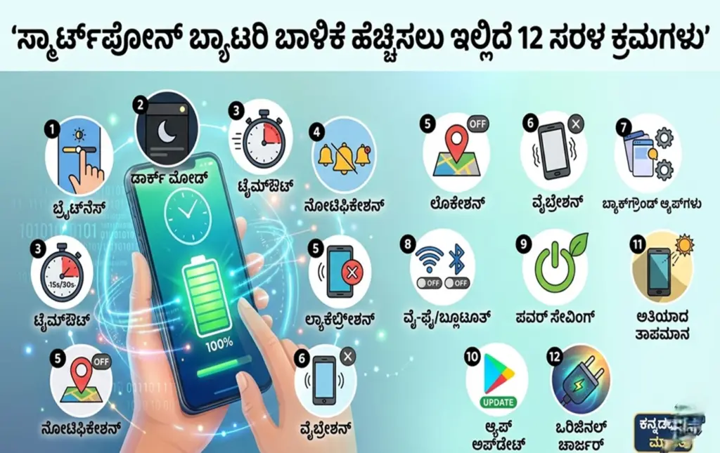 ಬೆಂಗಳೂರು: ಇಂದಿನ ಡಿಜಿಟಲ್ ಯುಗದಲ್ಲಿ ಸ್ಮಾರ್ಟ್ಫೋನ್ ಇಲ್ಲದೆ ಒಂದು ಕ್ಷಣವೂ ಕಳೆಯುವುದು ಕಷ್ಟ. ಆದರೆ ಹೆಚ್ಚಿನ ಬಳಕೆದಾರರನ್ನು ಕಾಡುವ ಪ್ರಮುಖ ಸಮಸ್ಯೆ ಎಂದರೆ ಅದು ‘ಬ್ಯಾಟರಿ ಬ್ಯಾಕಪ್’. ಹೊಸ ಫೋನ್ ಕೊಂಡಾಗ ದೀರ್ಘಕಾಲ ಬರುವ ಬ್ಯಾಟರಿ, ದಿನ ಕಳೆದಂತೆ ಬೇಗನೆ ಖಾಲಿಯಾಗಲು ಶುರುವಾಗುತ್ತದೆ. ಈ ಸಮಸ್ಯೆಯಿಂದ ಮುಕ್ತಿ ಪಡೆಯಲು ಮತ್ತು ನಿಮ್ಮ ಫೋನ್ ಬ್ಯಾಟರಿ ಜೀವಿತಾವಧಿಯನ್ನು ಹೆಚ್ಚಿಸಲು ಈ ಕೆಳಗಿನ 12 ಸಲಹೆಗಳನ್ನು ತಪ್ಪದೇ ಪಾಲಿಸಿ.