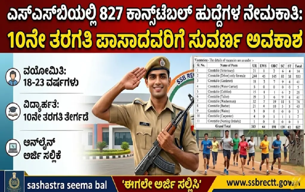 ಎಸ್‌ಎಸ್‌ಬಿಯಲ್ಲಿ 827 ಕಾನ್ಸ್‌ಟೆಬಲ್ ಹುದ್ದೆಗಳ ನೇಮಕಾತಿ: 10ನೇ ತರಗತಿ ಪಾಸಾದವರಿಗೆ ಸುವರ್ಣ ಅವಕಾಶ