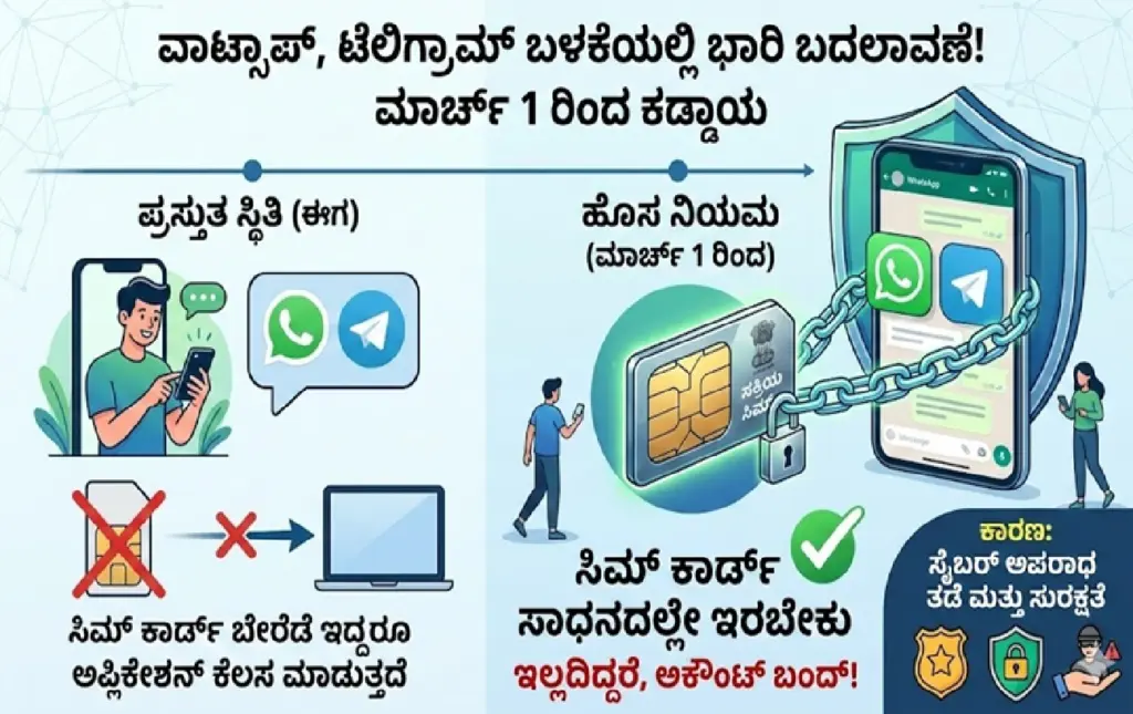 ಮಾರ್ಚ್ 1 ರಿಂದ ಭಾರತದ ಕೋಟ್ಯಂತರ ಇಂಟರ್ನೆಟ್ ಬಳಕೆದಾರರಿಗೆ ಪ್ರಮುಖ ಬದಲಾವಣೆಯೊಂದು ಎದುರಾಗಲಿದೆ. ನೀವು ವಾಟ್ಸಾಪ್ (WhatsApp) ಅಥವಾ ಟೆಲಿಗ್ರಾಮ್ (Telegram) ಬಳಕೆದಾರರಾಗಿದ್ದರೆ, ಈ ಹೊಸ ನಿಯಮದ ಬಗ್ಗೆ ತಿಳಿದುಕೊಳ್ಳುವುದು ಅತ್ಯಗತ್ಯ. ಕೇಂದ್ರ ದೂರಸಂಪರ್ಕ ಇಲಾಖೆಯ (DoT) ಹೊಸ ನಿರ್ದೇಶನದಂತೆ, ಇನ್ಮುಂದೆ “ಸಿಮ್ ಬೈಂಡಿಂಗ್” (SIM Binding) ಪ್ರಕ್ರಿಯೆ ಕಡ್ಡಾಯವಾಗಲಿದೆ.