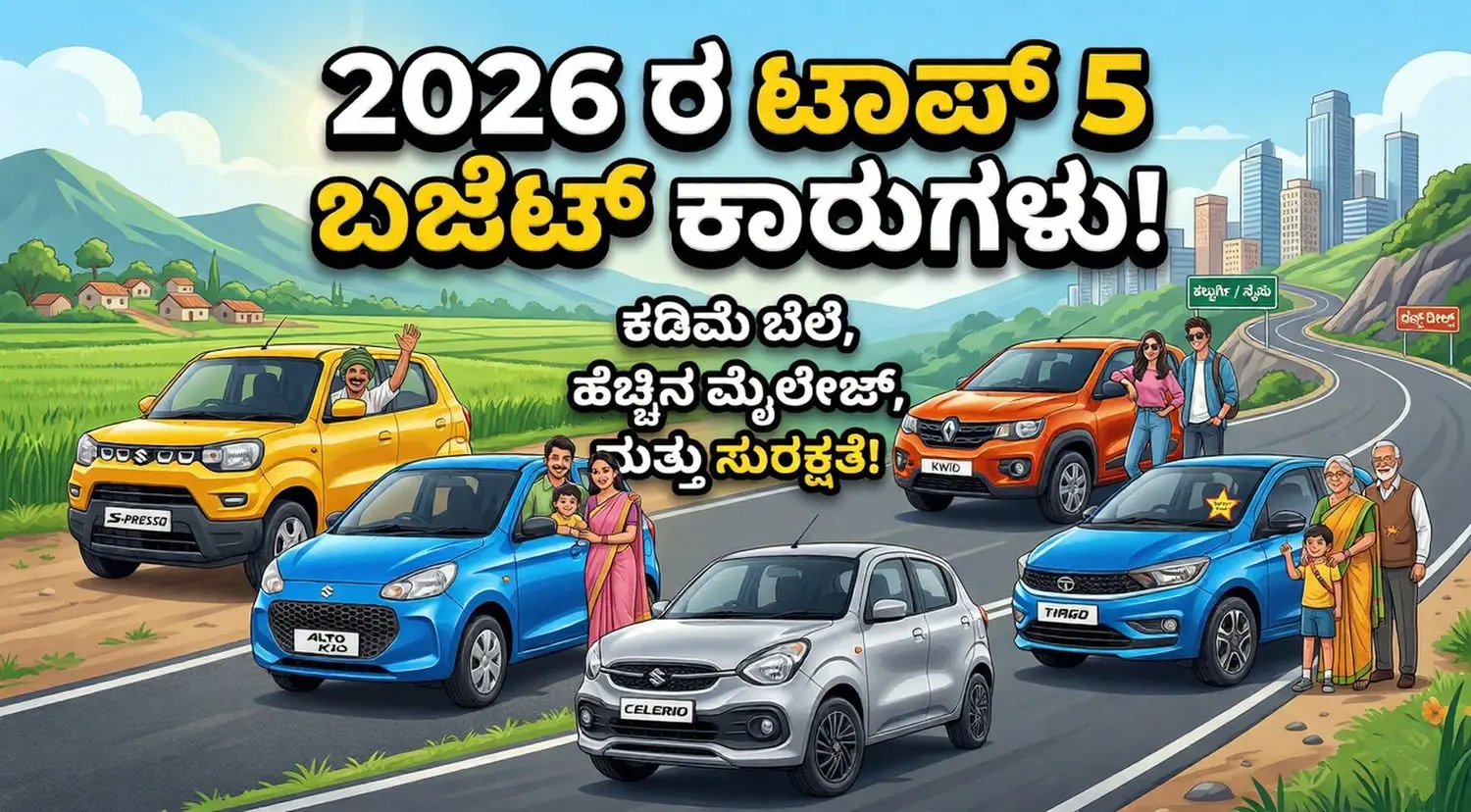 ರೈತರು, ಸಣ್ಣ ಉದ್ಯಮಿಗಳು ಮತ್ತು ಮೊದಲ ಬಾರಿ ಕಾರ್ ಖರೀದಿಸುವವರಿಗಾಗಿ ಇಲ್ಲಿವೆ 2026ರ ಟಾಪ್ 5 ಬಜೆಟ್ ಕಾರುಗಳ ಸಂಪೂರ್ಣ ವಿವರ.
