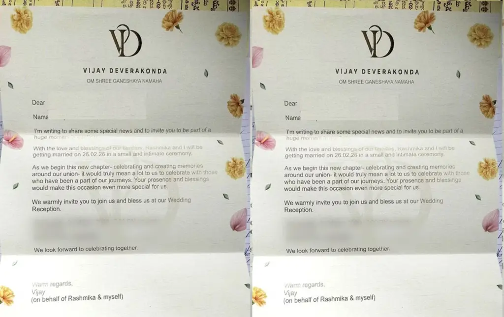 ದಂಪತಿಗಳಿಂದ ಅಧಿಕೃತ ದೃಢೀಕರಣಕ್ಕಾಗಿ ಕಾಯುತ್ತಿರುವಾಗ, ಸೋರಿಕೆಯಾದ ಆಮಂತ್ರಣಗಳು ಮತ್ತು ದೃಶ್ಯಗಳು ಅಭಿಮಾನಿಗಳು ದೀರ್ಘಕಾಲದಿಂದ ಅನುಮಾನಿಸುತ್ತಿರುವುದನ್ನು ದೃಢಪಡಿಸಿವೆ. ಫೆಬ್ರವರಿ 26 ಹತ್ತಿರವಾಗುತ್ತಿದ್ದಂತೆ, ವಿಜಯ್ ದೇವರಕೊಂಡ ಮತ್ತು ರಶ್ಮಿಕಾ ಮಂದಣ್ಣ ನವವಿವಾಹಿತರನ್ನು ನೋಡಲು ಅಭಿಮಾನಿಗಳು ಉಸಿರು ಬಿಗಿಹಿಡಿದು ಕಾಯುತ್ತಿದ್ದಾರೆ.