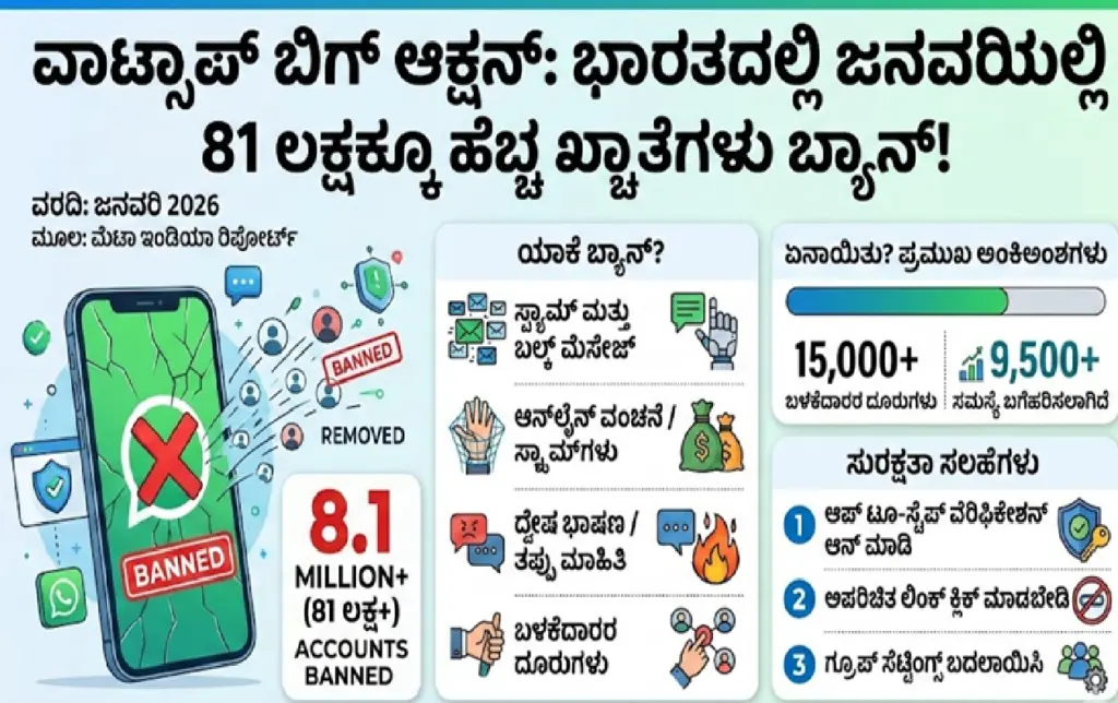 ನವದೆಹಲಿ : ಜನಪ್ರಿಯ ಮೆಸೇಜಿಂಗ್ ಆ್ಯಪ್ ವಾಟ್ಸಾಪ್ (WhatsApp), 2026ರ ಜನವರಿ ತಿಂಗಳಲ್ಲಿ ಭಾರತದಲ್ಲಿ ಬರೋಬ್ಬರಿ 81 ಲಕ್ಷಕ್ಕೂ ಅಧಿಕ (8.1 Million+) ಖಾತೆಗಳನ್ನು ನಿಷೇಧಿಸಿದೆ. ಭಾರತದ ಮಾಹಿತಿ ತಂತ್ರಜ್ಞಾನ (IT) ನಿಯಮಗಳು 2021 ರ ಅನ್ವಯ ಬಿಡುಗಡೆ ಮಾಡಲಾದ ಮಾಸಿಕ ವರದಿಯಲ್ಲಿ ಈ ಅಂಶ ಬಹಿರಂಗವಾಗಿದೆ. ಆನ್ಲೈನ್ ವಂಚನೆ, ಸ್ಪ್ಯಾಮ್ ಮೆಸೇಜ್ಗಳು ಮತ್ತು ದುರುದ್ದೇಶಪೂರಿತ ಚಟುವಟಿಕೆಗಳನ್ನು ತಡೆಗಟ್ಟುವ ಉದ್ದೇಶದಿಂದ ಮೆಟಾ (Meta) ಒಡೆತನದ ಈ ಸಂಸ್ಥೆಯು ಈ ಕಠಿಣ ಕ್ರಮ ಕೈಗೊಂಡಿದೆ.