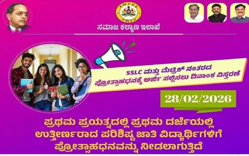 ಎಸ್ ಎಸ್ ಎಲ್ ಸಿ ಮತ್ತು ಮೆಟ್ರಿಕ್ ನಂತರದ ಪ್ರೋತ್ಸಾಹಧನಕ್ಕೆ ಅರ್ಜಿ ಸಲ್ಲಿಸಲು ದಿನಾಂಕ 28-02-2026ರವರೆಗೆ ಅವಧಿಯನ್ನು ವಿಸ್ತರಿಸಲಾಗಿದೆ. ಪರಿಶಿಷ್ಟ ಜಾತಿಯ ವಿದ್ಯಾರ್ಥಿಗಳು ಸೇವಾಸಿಂಧು ಪೋರ್ಟಲ್ ಮೂಲಕ ತಪ್ಪದೇ ಅರ್ಜಿ ಸಲ್ಲಿಸುವಂತೆ ಸಮಾಜ ಕಲ್ಯಾಣ ಇಲಾಖೆ ಕೋರಿದೆ.
