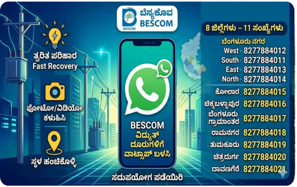 English Summary : BESCOM has introduced 11 dedicated WhatsApp helpline numbers across 8 districts for instant resolution of electricity-related issues. Customers can now easily report power cuts or hazards by sharing photos, videos, and live locations directly to their respective district’s WhatsApp number for quick action.