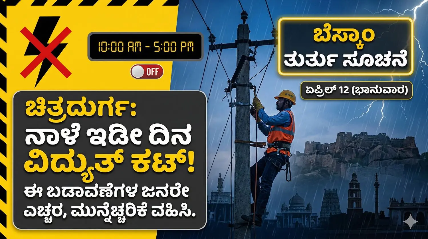 ಚಿತ್ರದುರ್ಗ (Chitradurga) ನಗರದ ನಾಗರಿಕರಿಗೆ ಬೆಸ್ಕಾಂ (BESCOM) ಪ್ರಮುಖ ಸೂಚನೆಯೊಂದನ್ನು ನೀಡಿದೆ. ನಗರದ ಮೂಲಸೌಕರ್ಯ ಅಭಿವೃದ್ಧಿ ಮತ್ತು ವಿದ್ಯುತ್ ಮಾರ್ಗಗಳ ತುರ್ತು ನಿರ್ವಹಣಾ ಕಾರ್ಯದ ಹಿನ್ನೆಲೆಯಲ್ಲಿ, ಕೆಲವು ಪ್ರಮುಖ ಬಡಾವಣೆಗಳಲ್ಲಿ ವಿದ್ಯುತ್ ಸರಬರಾಜಿನಲ್ಲಿ ವ್ಯತ್ಯಯ ಉಂಟಾಗಲಿದೆ. ಈ ಲೇಖನದಲ್ಲಿ ನಾವು ನಾಳೆಯ ವಿದ್ಯುತ್ ಕಡಿತದ ಸಮಯ, ಪ್ರಭಾವಿತ ಪ್ರದೇಶಗಳು ಮತ್ತು ಸಾರ್ವಜನಿಕರು ಕೈಗೊಳ್ಳಬೇಕಾದ ಮುನ್ನೆಚ್ಚರಿಕೆಗಳ ಬಗ್ಗೆ ಸವಿಸ್ತಾರವಾದ ಮಾಹಿತಿಯನ್ನು ನೀಡುತ್ತಿದ್ದೇವೆ.