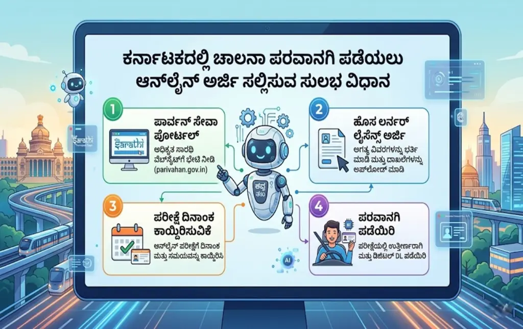 ಬೆಂಗಳೂರು : ಇಂದಿನ ದಿನಗಳಲ್ಲಿ ಪ್ರತಿಯೊಬ್ಬರಿಗೂ ಚಾಲನಾ ಪರವಾನಗಿ (Driving License) ಅತ್ಯಗತ್ಯವಾದ ದಾಖಲೆಯಾಗಿದೆ. ಚಾಲನೆ ಮಾಡುವವರಿಗೆ ಮಾತ್ರವಲ್ಲದೆ ಇದೊಂದು ಪ್ರಮುಖ ಗುರುತಿನ ಚೀಟಿಯಾಗಿಯೂ ಬಳಕೆಯಾಗುತ್ತದೆ. ಈಗ ಕರ್ನಾಟಕದಲ್ಲಿ ಆನ್ಲೈನ್ ಮೂಲಕವೇ ಸುಲಭವಾಗಿ ಲೈಸೆನ್ಸ್ ಪಡೆಯಲು ಸಾರಿಗೆ ಇಲಾಖೆಯು ಅವಕಾಶ ನೀಡಿದೆ. ಈ ಪ್ರಕ್ರಿಯೆಯು ಪ್ರಮುಖವಾಗಿ ಎರಡು ಹಂತಗಳಲ್ಲಿ ನಡೆಯುತ್ತದೆ.