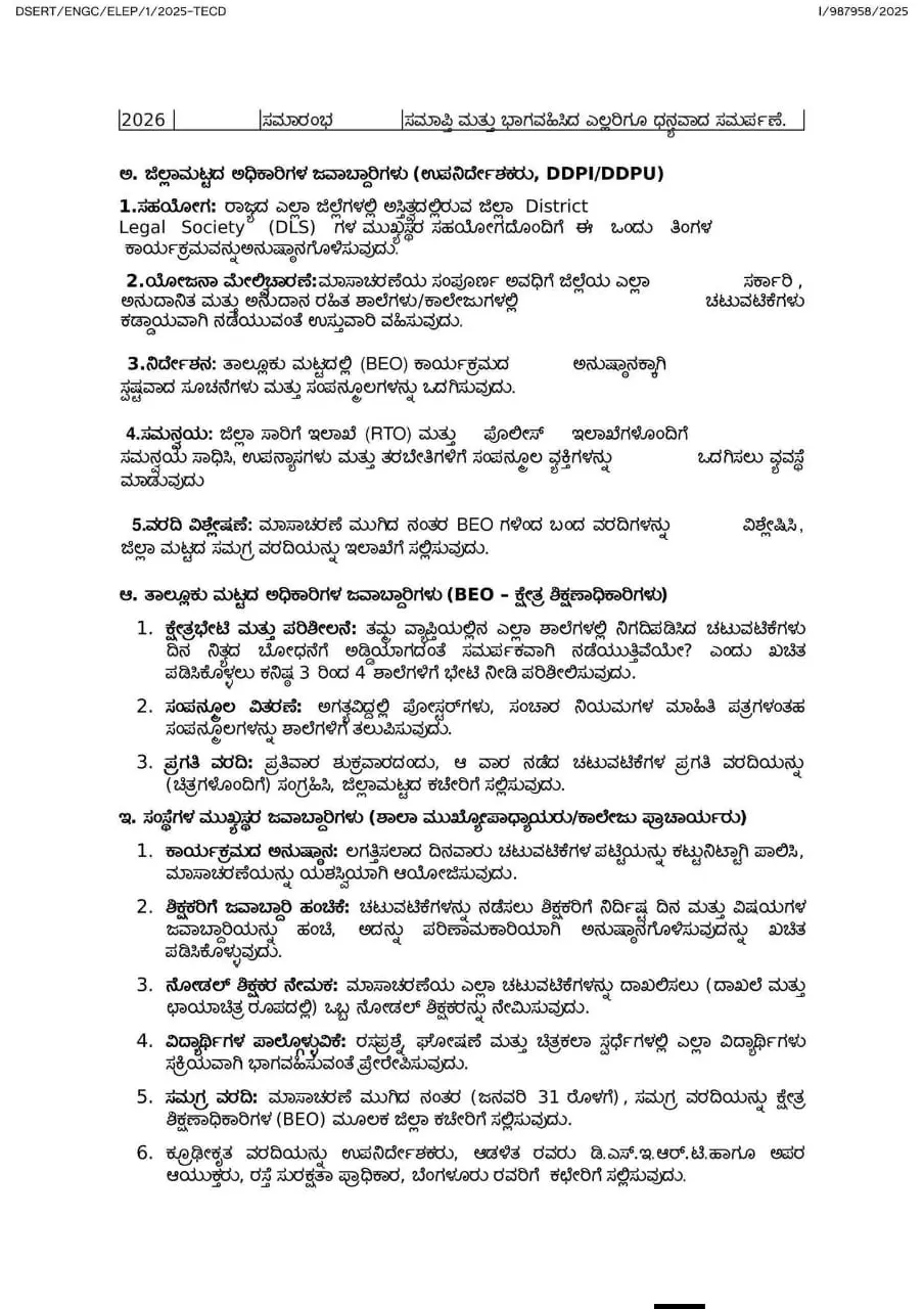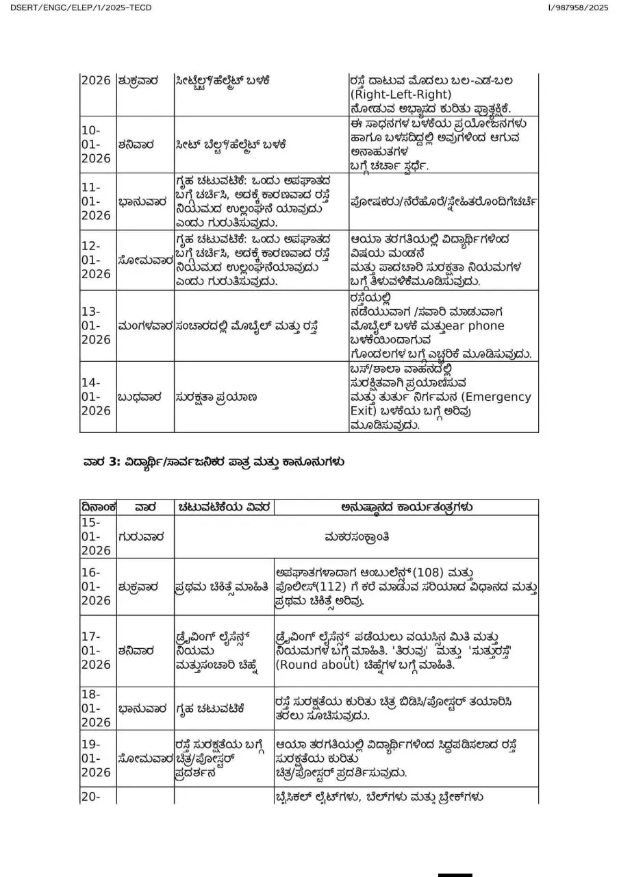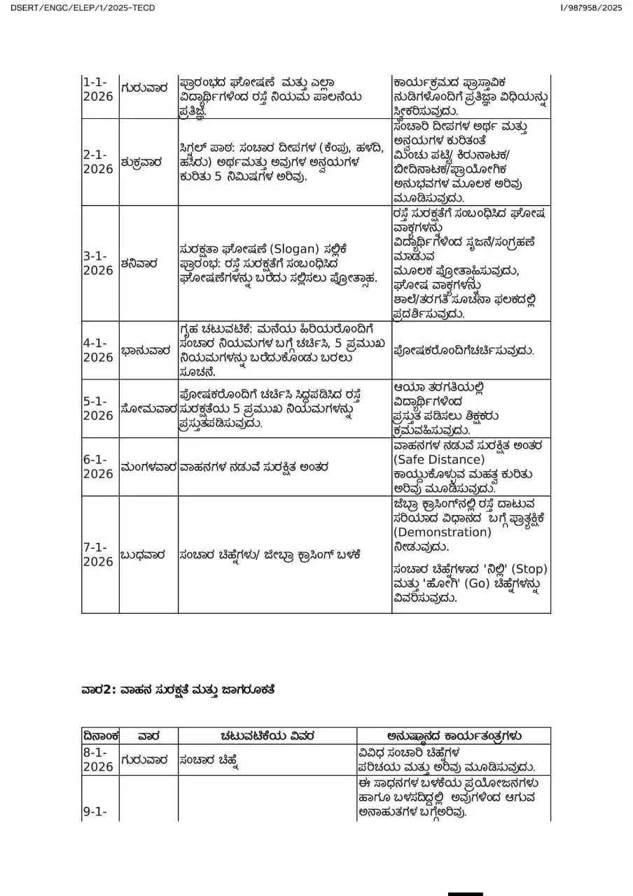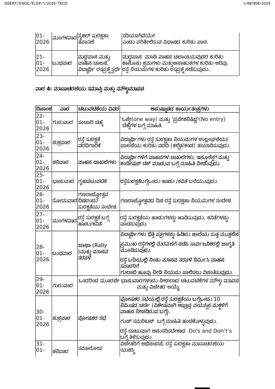 ಶಿಕ್ಷಣ ಇಲಾಖೆಯು ಶಾಲಾ ಮಕ್ಕಳಲ್ಲಿ ರಸ್ತೆ ಸುರಕ್ಷತಾ ಸಂಸ್ಕೃತಿಯನ್ನು ಬೆಳೆಸಲು, ಪ್ರಾಯೋಗಿಕ ಅಧಯನದ ಮೂಲಕ ನಿಯಮಪಾಲನೆಯ ಮಹತ್ತವನ್ನು ಮನವರಿಕೆ ಮಾಡಲು ಮತ್ತು ಸಮಗ್ರ ಸಮಾಜದಲ್ಲಿ ರಸ್ತೆ ಶಿಸ್ತು ಹೆಚ್ಚಿಸಲು ಈ ಅಭಿಯಾನವನ್ನು ಬಲವಾಗಿ ಬೆಂಬಲಿಸುತ್ತದೆ. ಉಲ್ಲೇಖ[1]ರ ದಿನಾಂಕ:06.12.20258 ಸಭೆಯಲ್ಲಿ ಚರ್ಚಿಸಿ ಸಮಿತಿಯು ಸೂಚಿಸಿದ ಅಂಶಗಳನ್ವಯ ರಾಜ್ಯದ ಎಲ್ಲಾ ಶಾಲೆಗಳು ಮತ್ತು ಪದವಿಪೂರ್ವ ಕಾಲೇಜು ವಿದ್ಯಾರ್ಥಿಗಳಲ್ಲಿ ರಸ್ತೆ ಸುರಕ್ಷತೆಯ ಬಗ್ಗೆ ಜಾಗೃತಿ ಮೂಡಿಸಲು ಜನವರಿ 1 ರಿಂದ ಜನವರಿ 31, 2026 ರವರೆಗೆ ಒಂದುತಿಂಗಳ ಕಾಲ “ರಸ್ತೆ ಸುರಕ್ಷತಾ ಮಾಸಾಚರಣೆ” ಯನ್ನು ಹಮ್ಮಿಕೊಳ್ಳಲು ತೀರ್ಮಾನಿಸಲಾಗಿದೆ. ಈ ಮಾಸಾಚರಣೆಯಲ್ಲಿನ ಚಟುವಟಿಕೆಗಳನ್ನು ವಿದ್ಯಾರ್ಥಿಗಳ ದಿನನಿತ್ತದ ಬೋಧನಾ ಪ್ರಕ್ರಿಯೆಗೆ ಯಾವುದೇ ತೊಂದರೆಯಾಗದಂತೆ, ಸರಳವಾಗಿ ನಡೆಸಲು ಸೂಚಿಸಲಾಗಿದೆ. ಯಶಸ್ವಿ ಅನುಷ್ಠಾನಕ್ಕಾಗಿ ಪ್ರತಿದಿನದ ಚಟುವಟಿಕೆ ಮತ್ತು ಅನುಷ್ಠಾನ ಕಾರ್ಯತಂತ್ರಗಳನ್ನು ಸ್ಪಷ್ಟಪಡಿಸಲಾಗಿದೆ. ಸಂಸ್ಥೆಯ ಮುಖ್ಯಸ್ಥರು, ಶಿಕ್ಷಕರು ಮತ್ತು ಸಿಬ್ಬಂದಿವರ್ಗದವರು ಈ ಚಟುವೆಟಿಕೆಗಳನ್ನು ಜವಾಬ್ದಾರಿಯತವಾಗಿ ಮತ್ತು ಕಡ್ಡಾಯವಾಗಿ ನಡೆಸಲು ಅಗತ್ಯ ಕ್ರಮಗಳನ್ನು ಕೈಗೊಳ್ಳಲು ಸೂಚಿಸಿದೆ.
