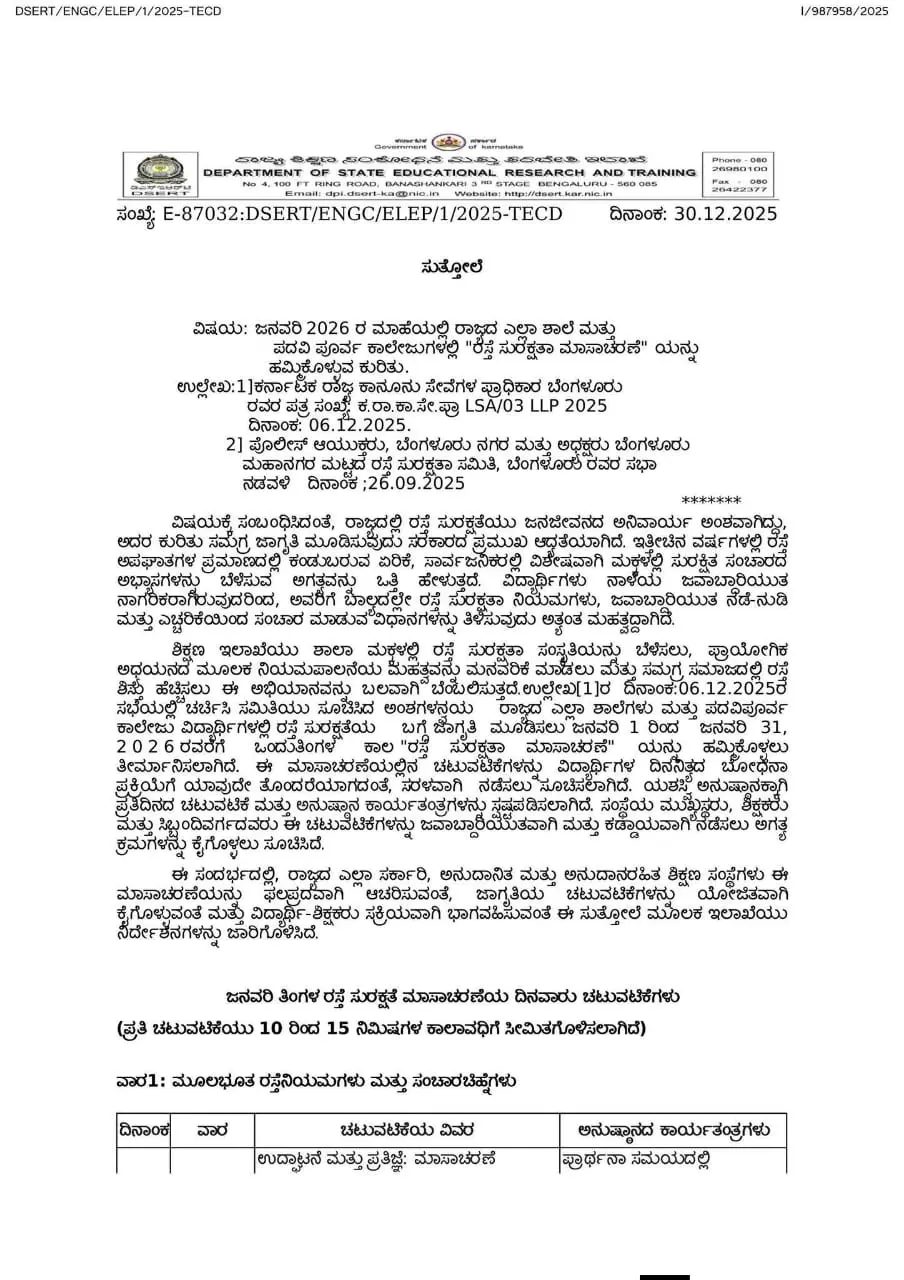 ಶಿಕ್ಷಣ ಇಲಾಖೆಯು ಶಾಲಾ ಮಕ್ಕಳಲ್ಲಿ ರಸ್ತೆ ಸುರಕ್ಷತಾ ಸಂಸ್ಕೃತಿಯನ್ನು ಬೆಳೆಸಲು, ಪ್ರಾಯೋಗಿಕ ಅಧಯನದ ಮೂಲಕ ನಿಯಮಪಾಲನೆಯ ಮಹತ್ತವನ್ನು ಮನವರಿಕೆ ಮಾಡಲು ಮತ್ತು ಸಮಗ್ರ ಸಮಾಜದಲ್ಲಿ ರಸ್ತೆ ಶಿಸ್ತು ಹೆಚ್ಚಿಸಲು ಈ ಅಭಿಯಾನವನ್ನು ಬಲವಾಗಿ ಬೆಂಬಲಿಸುತ್ತದೆ. ಉಲ್ಲೇಖ[1]ರ ದಿನಾಂಕ:06.12.20258 ಸಭೆಯಲ್ಲಿ ಚರ್ಚಿಸಿ ಸಮಿತಿಯು ಸೂಚಿಸಿದ ಅಂಶಗಳನ್ವಯ ರಾಜ್ಯದ ಎಲ್ಲಾ ಶಾಲೆಗಳು ಮತ್ತು ಪದವಿಪೂರ್ವ ಕಾಲೇಜು ವಿದ್ಯಾರ್ಥಿಗಳಲ್ಲಿ ರಸ್ತೆ ಸುರಕ್ಷತೆಯ ಬಗ್ಗೆ ಜಾಗೃತಿ ಮೂಡಿಸಲು ಜನವರಿ 1 ರಿಂದ ಜನವರಿ 31, 2026 ರವರೆಗೆ ಒಂದುತಿಂಗಳ ಕಾಲ “ರಸ್ತೆ ಸುರಕ್ಷತಾ ಮಾಸಾಚರಣೆ” ಯನ್ನು ಹಮ್ಮಿಕೊಳ್ಳಲು ತೀರ್ಮಾನಿಸಲಾಗಿದೆ. ಈ ಮಾಸಾಚರಣೆಯಲ್ಲಿನ ಚಟುವಟಿಕೆಗಳನ್ನು ವಿದ್ಯಾರ್ಥಿಗಳ ದಿನನಿತ್ತದ ಬೋಧನಾ ಪ್ರಕ್ರಿಯೆಗೆ ಯಾವುದೇ ತೊಂದರೆಯಾಗದಂತೆ, ಸರಳವಾಗಿ ನಡೆಸಲು ಸೂಚಿಸಲಾಗಿದೆ. ಯಶಸ್ವಿ ಅನುಷ್ಠಾನಕ್ಕಾಗಿ ಪ್ರತಿದಿನದ ಚಟುವಟಿಕೆ ಮತ್ತು ಅನುಷ್ಠಾನ ಕಾರ್ಯತಂತ್ರಗಳನ್ನು ಸ್ಪಷ್ಟಪಡಿಸಲಾಗಿದೆ. ಸಂಸ್ಥೆಯ ಮುಖ್ಯಸ್ಥರು, ಶಿಕ್ಷಕರು ಮತ್ತು ಸಿಬ್ಬಂದಿವರ್ಗದವರು ಈ ಚಟುವೆಟಿಕೆಗಳನ್ನು ಜವಾಬ್ದಾರಿಯತವಾಗಿ ಮತ್ತು ಕಡ್ಡಾಯವಾಗಿ ನಡೆಸಲು ಅಗತ್ಯ ಕ್ರಮಗಳನ್ನು ಕೈಗೊಳ್ಳಲು ಸೂಚಿಸಿದೆ.