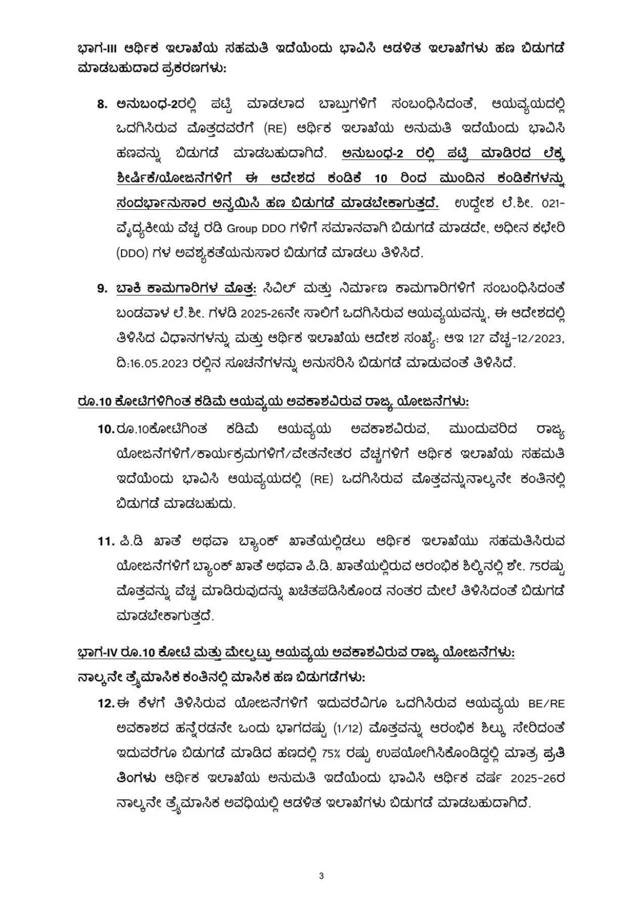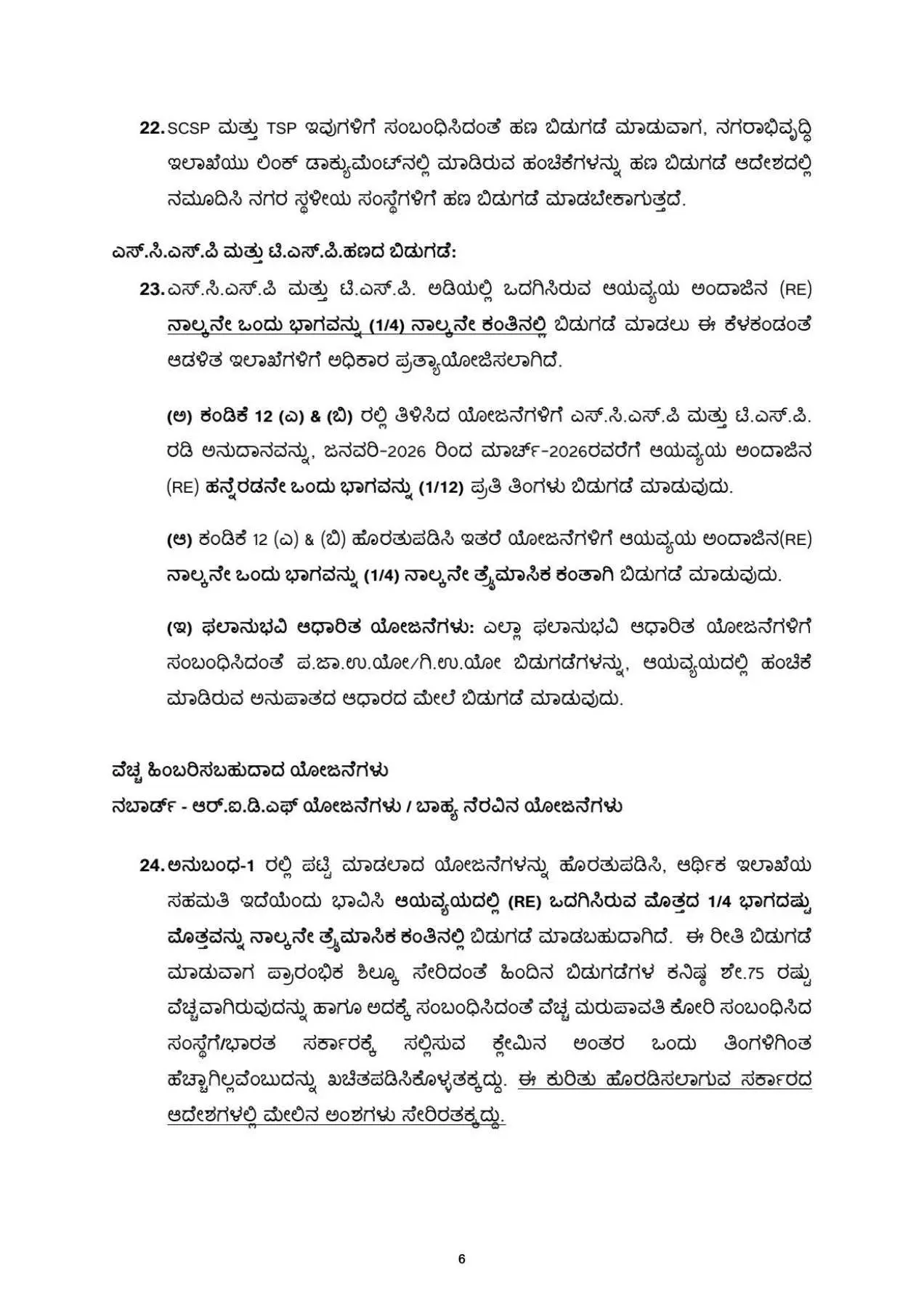 ನಾಲ್ಕನೇ ತ್ರೈಮಾಸಿಕ ಕಂತಿನಲ್ಲಿ ಮಾಸಿಕ ಹಣ ಬಿಡುಗಡೆಗಳು: ಈ ಕೆಳಗೆ ತಿಳಿಸಿರುವ ಯೋಜನೆಗಳಿಗೆ ಇದುವರೆವಿಗೂ ಒದಗಿಸಿರುವ ಆಯವ್ಯಯ BE/RE ಅವಕಾಶದ ಹನ್ನೆರಡನೇ ಒಂದು ಭಾಗದಷ್ಟು (1/12) ಮೊತ್ತವನ್ನು ಆರಂಭಿಕ ಶಿಲ್ಕು ಸೇರಿದಂತೆ ಇದುವರೆಗೂ ಬಿಡುಗಡೆ ಮಾಡಿದ ಹಣದಲ್ಲಿ 75% ರಷ್ಟು ಉಪಯೋಗಿಸಿಕೊಂಡಿದ್ದಲ್ಲಿ ಮಾತ್ರ ಪ್ರತಿ ತಿಂಗಳು ಆರ್ಥಿಕ ಇಲಾಖೆಯ ಅನುಮತಿ ಇದೆಯೆಂದು ಭಾವಿಸಿ ಆರ್ಥಿಕ ವರ್ಷ 2025-26ರ ನಾಲ್ಕನೇ ತ್ರೈಮಾಸಿಕ ಅವಧಿಯಲ್ಲಿ ಆಡಳಿತ ಇಲಾಖೆಗಳು ಬಿಡುಗಡೆ ಮಾಡಬಹುದಾಗಿದೆ.
