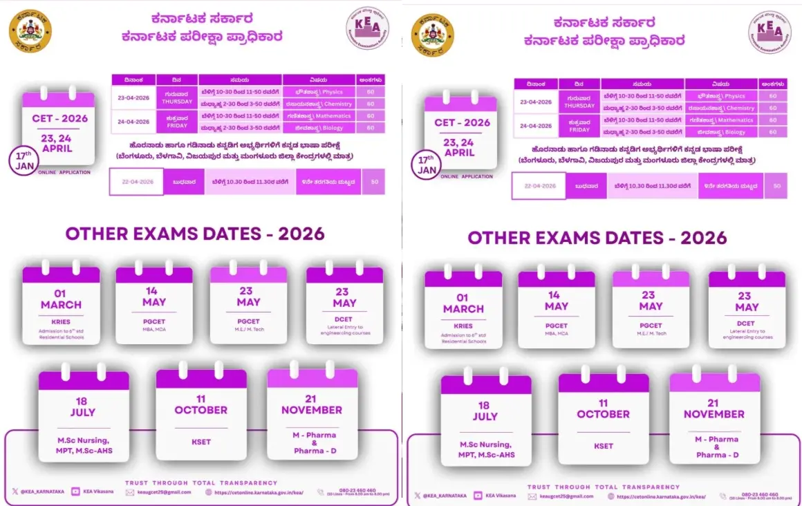 * 2025ರಲ್ಲಿ ಎದುರಾದ ಸವಾಲುಗಳನ್ನು ಗಮನದಲ್ಲಿ ಇಟ್ಟುಕೊಂಡು 2026ನೇ ಸಾಲಿನ ಸಿಇಟಿ ಪ್ರಕ್ರಿಯೆಗೆ ಹೊಸ ರೀತಿಯಲ್ಲಿ ಸಿದ್ಧತೆ ಆರಂಭಿಸಲಾಗಿದೆ.