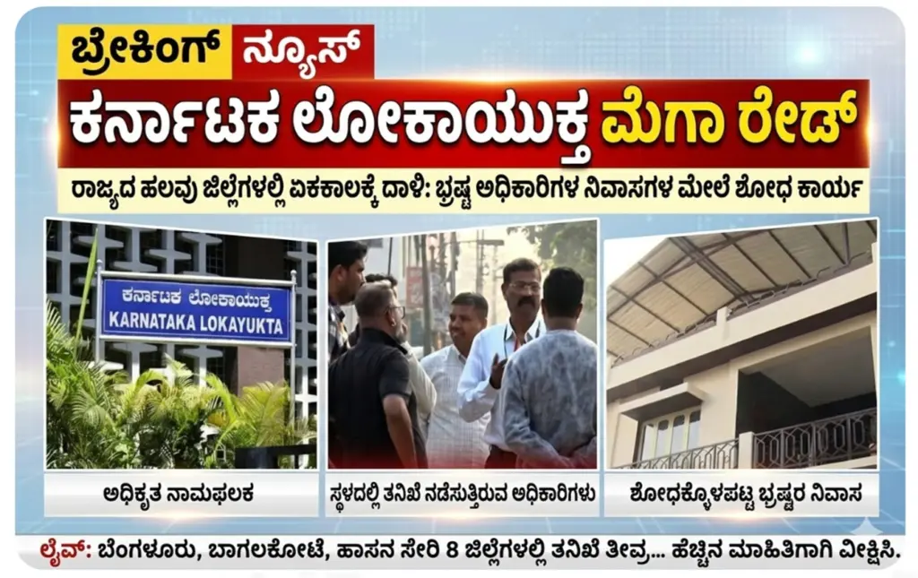 ಬೆಂಗಳೂರು, ಮೈಸೂರು, ಬಾಗಲಕೋಟೆ, ಮಂಡ್ಯ, ಧಾರವಾಡ, ಹಾಸನ, ವಿಜಯಪುರ ಮತ್ತು ಯಾದಗಿರಿ ಸೇರಿದಂತೆ ರಾಜ್ಯದ 8 ಜಿಲ್ಲೆಗಳಲ್ಲಿ ಏಕಕಾಲಕ್ಕೆ ಲೋಕಾಯುಕ್ತ ದಾಳಿ ನಡೆದಿದೆ. - ಹಾಸನದಲ್ಲಿ ಲೋಕಾಯುಕ್ತ ದಾಳಿ ವೇಳೆ ಏನಾಯಿತು?