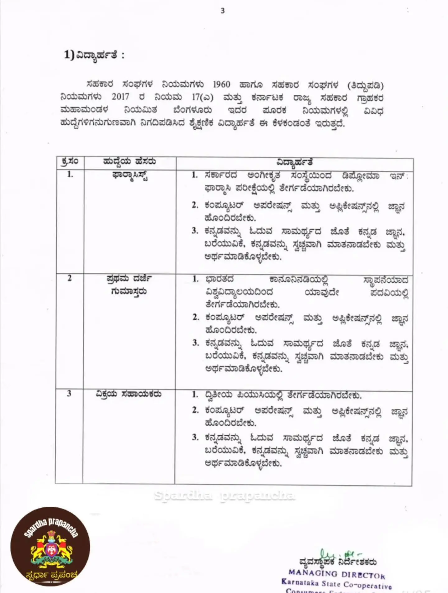 3 1) ವಿದ್ಯಾರ್ಹತೆ : ಸಹಕಾರ ಸಂಘಗಳ ನಿಯಮಗಳು 1960 ಹಾಗೂ ಸಹಕಾರ ಸಂಘಗಳ (ತಿದ್ದುಪಡಿ) ನಿಯಮಗಳು 2017 ರ ನಿಯಮ 17(ಎ) ಮತ್ತು ಕರ್ನಾಟಕ ರಾಜ್ಯ ಸಹಕಾರ ಗ್ರಾಹಕರ ಮಹಾಮಂಡಳ ನಿಯಮಿತ ಬೆಂಗಳೂರು ಇದರ ಪೂರಕ ನಿಯಮಗಳಲ್ಲಿ ವಿವಿಧ ಹುದ್ದೆಗಳಿಗನುಗುಣವಾಗಿ ನಿಗದಿಪಡಿಸಿದ ಶೈಕ್ಷಣಿಕ ವಿದ್ಯಾರ್ಹತೆ ಈ ಕೆಳಕಂಡಂತೆ ಇರುತ್ತದೆ.