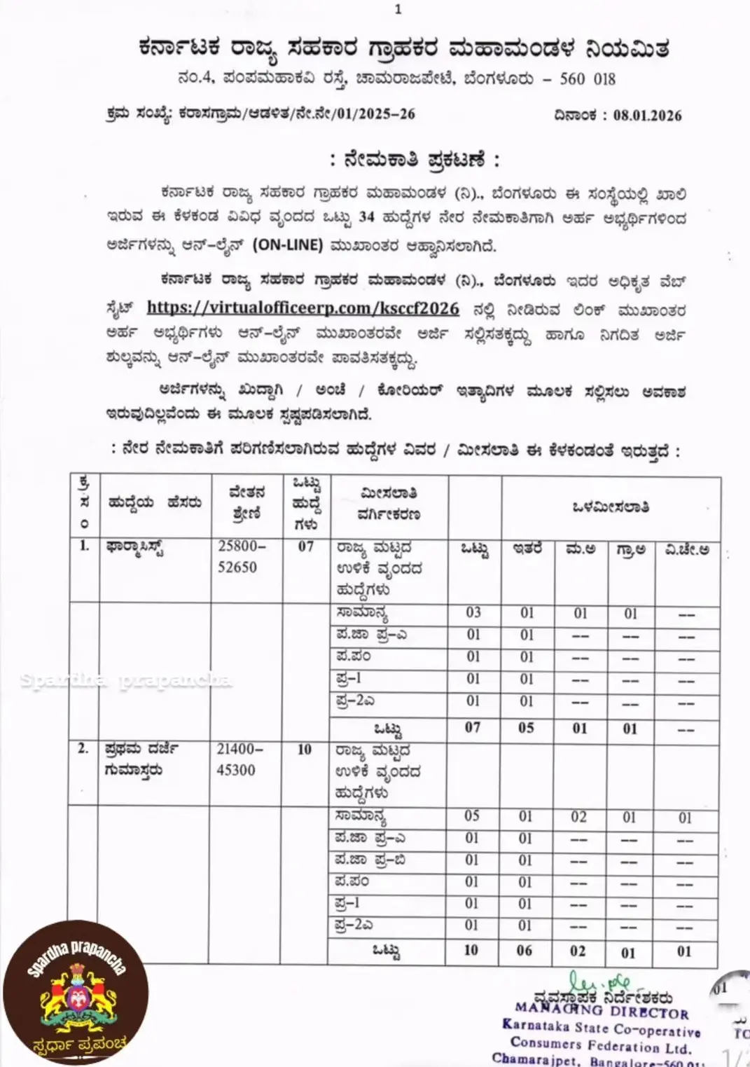 ಕರ್ನಾಟಕ ರಾಜ್ಯ ಸಹಕಾರ ಗ್ರಾಹಕರ ಮಹಾಮಂಡಳ (ನಿ)., ಬೆಂಗಳೂರು ಇದರ ಅಧಿಕೃತ ವೆಬ್ ಸೈಟ್ https://virtualofficeerp.com/ksccf2026 ನಲ್ಲಿ ನೀಡಿರುವ ಲಿಂಕ್ ಮುಖಾಂತರ ಅರ್ಹ ಅಭ್ಯರ್ಥಿಗಳು ಆನ್-ಲೈನ್ ಮುಖಾಂತರವೇ ಅರ್ಜಿ ಸಲ್ಲಿಸತಕ್ಕದ್ದು ಹಾಗೂ ನಿಗದಿತ ಅರ್ಜಿ ಶುಲ್ಕವನ್ನು ಆನ್-ಲೈನ್ ಮುಖಾಂತರವೇ ಪಾವತಿಸತಕ್ಕದ್ದು. ಅರ್ಜಿಗಳನ್ನು ಖುದ್ದಾಗಿ / ಅಂಚೆ / ಕೋರಿಯರ್ ಇತ್ಯಾದಿಗಳ ಮೂಲಕ ಸಲ್ಲಿಸಲು ಅವಕಾಶ ಇರುವುದಿಲ್ಲವೆಂದು ಈ ಮೂಲಕ ಸ್ಪಷ್ಟಪಡಿಸಲಾಗಿದೆ. ನೇರ ನೇಮಕಾತಿಗೆ ಪರಿಗಣಿಸಲಾಗಿರುವ ಹುದ್ದೆಗಳ ವಿವರ / ಮೀಸಲಾತಿ ಈ ಕೆಳಕಂಡಂತೆ ಇರುತ್ತದೆ.