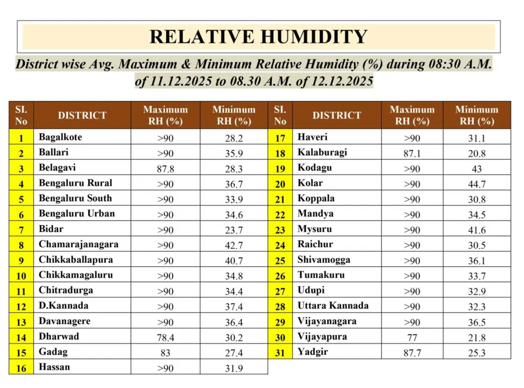 District-wise Average Minimum and Maximum Relative Humidity (%) table with maps from 08.30 AM of 11.12.25 to 08.30 AM of 12.12.25. #KSNDMC pic.twitter.com/evQPQmJ1Wr— Karnataka State Natural Disaster Monitoring Centre (@KarnatakaSNDMC) December 12, 2025