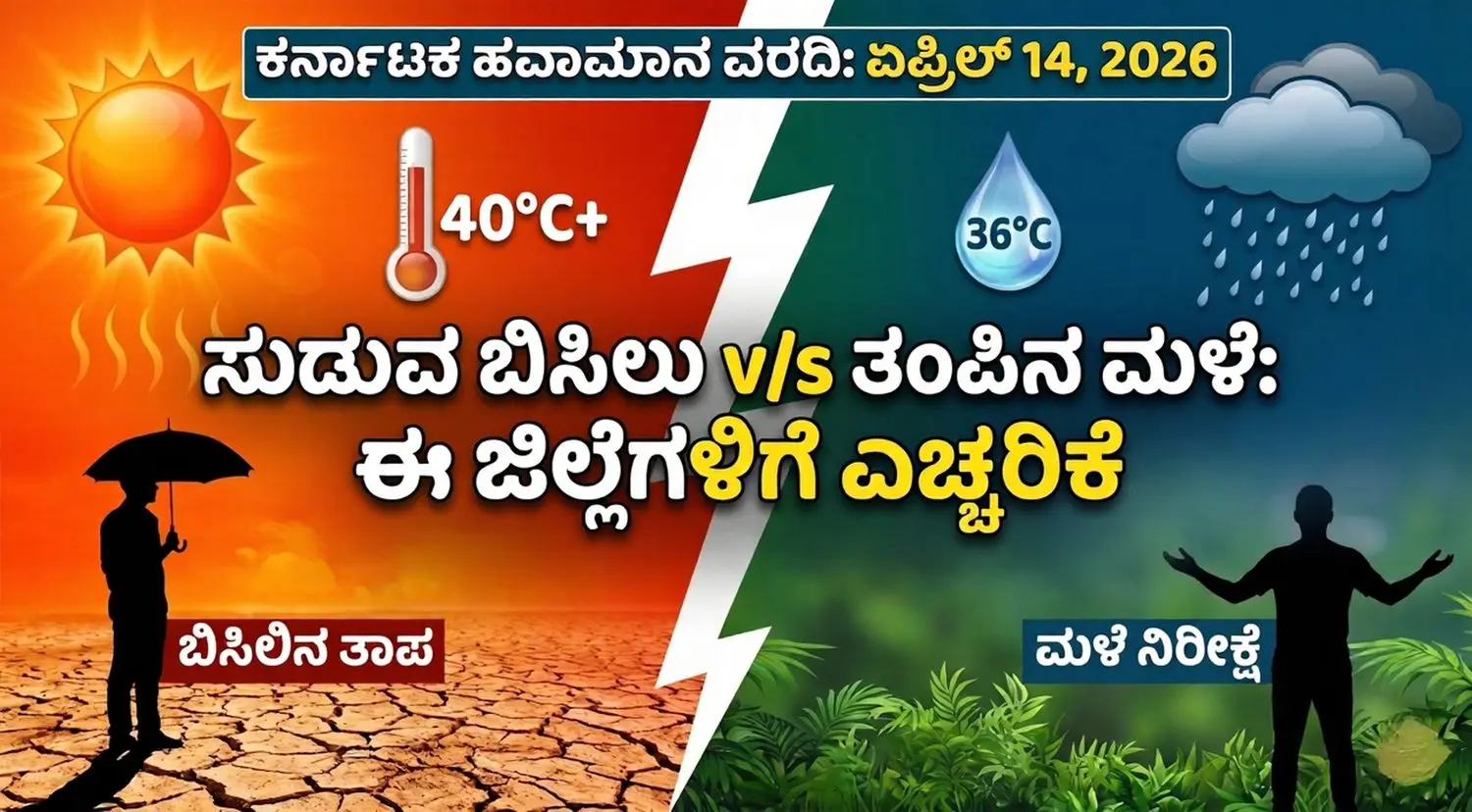 ಕರ್ನಾಟಕ ರಾಜ್ಯದಲ್ಲಿ ಬೇಸಿಗೆಯ ತಾಪವು ದಿನದಿಂದ ದಿನಕ್ಕೆ ಹೊಸ ದಾಖಲೆಗಳನ್ನು ಬರೆಯುತ್ತಿದೆ. ಏಪ್ರಿಲ್ 14 ರಂದು ರಾಜ್ಯದಾದ್ಯಂತ ಬಿಸಿಲಿನ ತೀವ್ರತೆ (Heat Intensity) ಗಣನೀಯವಾಗಿ ಹೆಚ್ಚಾಗಲಿದೆ ಎಂದು ಹವಾಮಾನ ಇಲಾಖೆ ತಿಳಿಸಿದೆ. ರಾಜಧಾನಿ ಬೆಂಗಳೂರು ಸೇರಿದಂತೆ ಉತ್ತರ ಕರ್ನಾಟಕದ ಜಿಲ್ಲೆಗಳಲ್ಲಿ ಜನರು ಬಿಸಿಲಿನ ಬೇಗೆಯಿಂದ ಕಂಗಾಲಾಗಿದ್ದಾರೆ. ಹವಾಮಾನ ಇಲಾಖೆಯ ವರದಿಯ ಪ್ರಕಾರ, ಒಂದೆಡೆ ತೀವ್ರ ಶಾಖವಿದ್ದರೆ, ಮತ್ತೊಂದೆಡೆ ಕೆಲವು ಜಿಲ್ಲೆಗಳಲ್ಲಿ ಅನಿರೀಕ್ಷಿತ ಮಳೆಯಾಗುವ ಸಾಧ್ಯತೆಯಿದೆ. ಇದು ಪ್ರಕೃತಿಯ ವಿಚಿತ್ರ ಆಟದಂತೆ ಭಾಸವಾಗುತ್ತಿದೆ.
