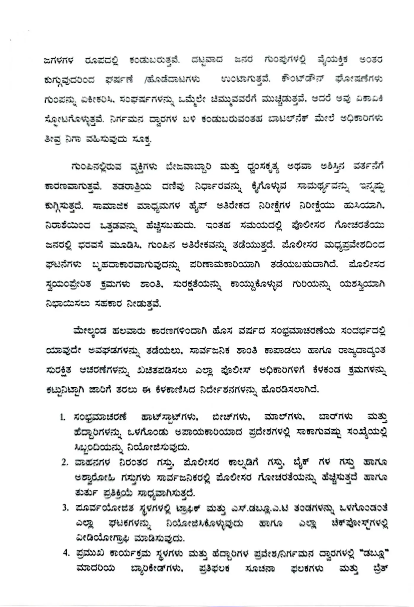 ಮೇಲ್ಕಂಡ ಹಲವಾರು ಕಾರಣಗಳಿಂದಾಗಿ ಹೊಸ ವರ್ಷದ ಸಂಭ್ರಮಾಚರಣೆಯ ಸಂದರ್ಭದಲ್ಲಿ ಯಾವುದೇ ಅವಘಡಗಳನ್ನು ತಡೆಯಲು, ಸಾರ್ವಜನಿಕ ಶಾಂತಿ ಕಾಪಾಡಲು ಹಾಗೂ ರಾಜ್ಯದಾದ್ಯಂತ ಸುರಕ್ಷಿತ ಆಚರಣೆಗಳನ್ನು ಖಚಿತಪಡಿಸಲು ಎಲ್ಲಾ ಪೊಲೀಸ್ ಅಧಿಕಾರಿಗಳಿಗೆ ಕೆಳಕಂಡ ಕ್ರಮಗಳನ್ನು ಕಟ್ಟುನಿಟ್ಟಾಗಿ ಜಾರಿಗೆ ತರಲು ಈ ಕೆಳಕಾಣಿಸಿದ ನಿರ್ದೇಶನಗಳನ್ನು ಹೊರಡಿಸಲಾಗಿದೆ.