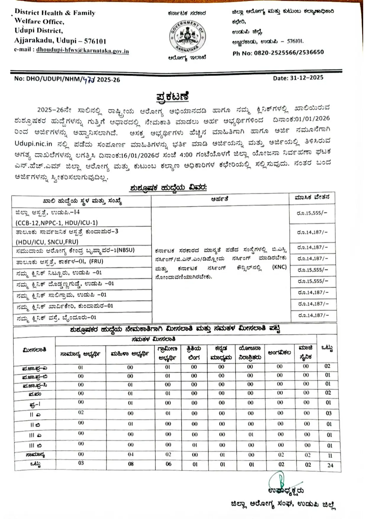 Application Invitation for 43 Nurse, Pharmacist and Other Posts in Udupi