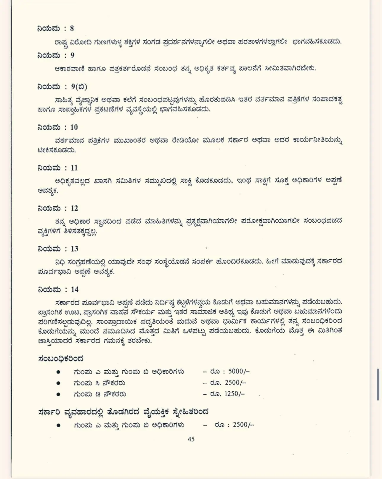 ಬೆಂಗಳೂರು : ರಾಜ್ಯ ಸರ್ಕಾರಿ ನೌಕರರೇ ಗಮನಿಸಿ. ಕರ್ನಾಟಕ ನಾಗರಿಕ ಸೇವೆ (ವರ್ತನೆ) ನಿಯಮಗಳು 1966ರ ಮುಖ್ಯಾಂಶಗಳು ಉಲ್ಲಂಘನೆಗೆ ವಿಧಿಸಬಹುದಾದ ದಂಡನೆಗಳು ಹಾಗೂ ಕೆ.ಸಿ.ಎಸ್. (ಸಿಸಿಎ) ನಿಯಮಗಳ ಸ್ಕೂಲ ಪರಿಚಯ ಇಲ್ಲಿದೆ.