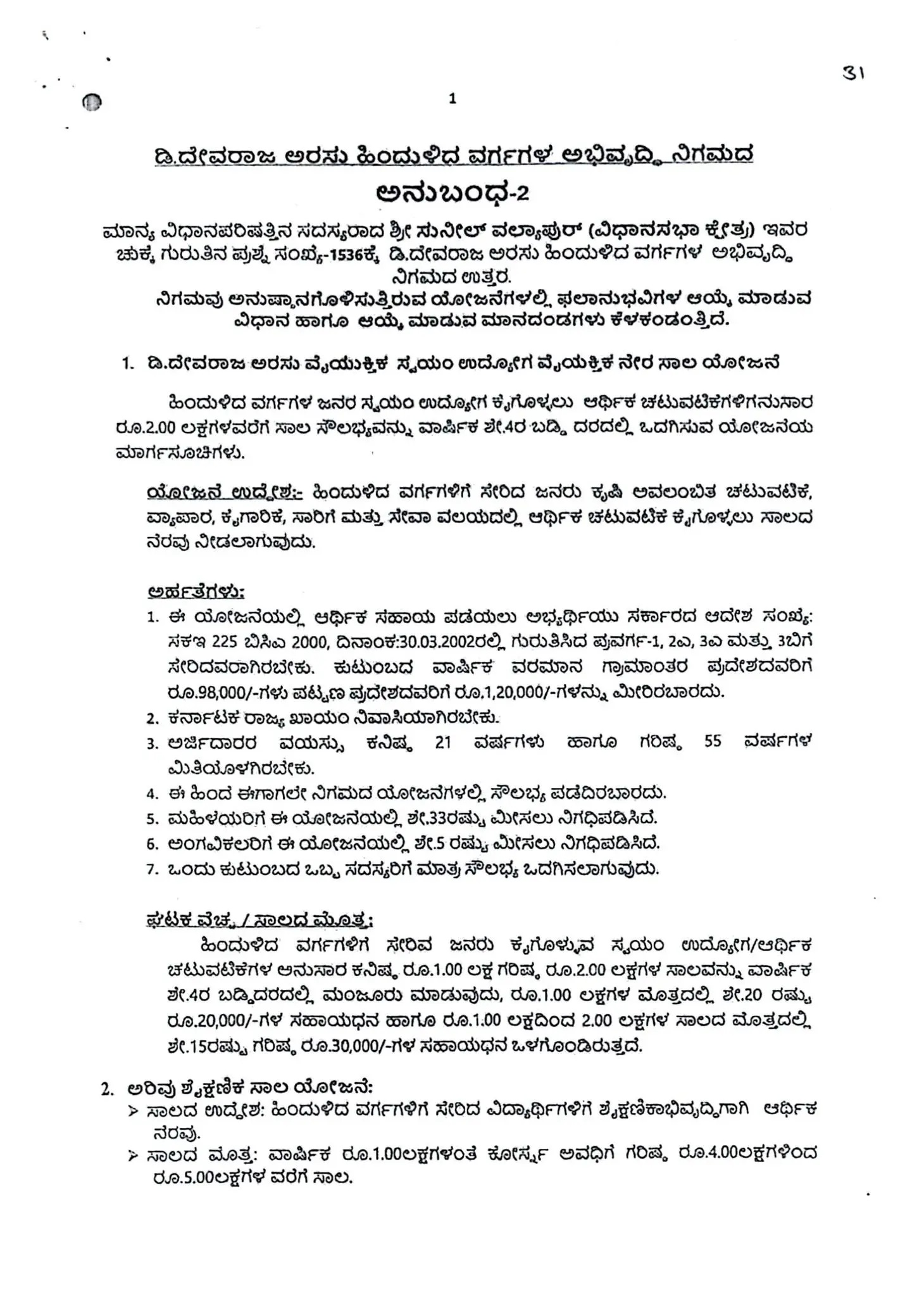 1. ಡಿ.ದೇವರಾಜ ಅರಸು ವೈಯುಕ್ತಿಕ ಸ್ವಯಂ ಉದ್ಯೋಗ ವೈಯಕ್ತಿಕ ನೇರ ಸಾಲ ಯೋಜನೆ