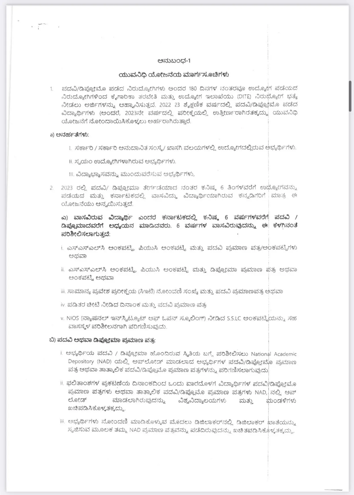 2023 ರಲ್ಲಿ ಪದವಿ/ ಡಿಪ್ಲೋಮಾ ತೇರ್ಗಡೆಯಾದ ನಂತರ ಕನಿಷ್ಠ 6 ತಿಂಗಳವರೆಗೆ ಉದ್ಯೋಗವನ್ನು ಪಡೆಯದ ಮತ್ತು ಕರ್ನಾಟಕದಲ್ಲಿ ವಾಸವಿದ್ದು ವಿದ್ಯಾರ್ಥಿಯಾಗಿರುವ ಕನ್ನಡಿಗರಿಗೆ ಮಾತ್ರ ಈ ಯೋಜನೆಯು ಅನ್ವಯಿಸುತ್ತದೆ.